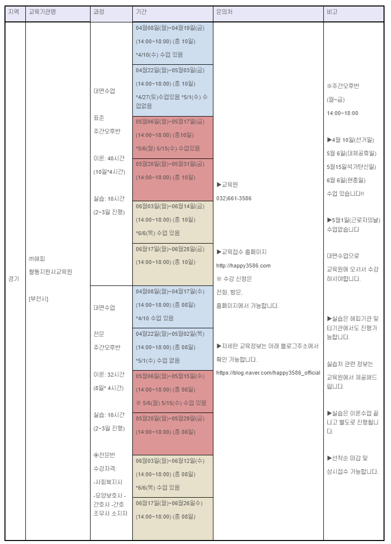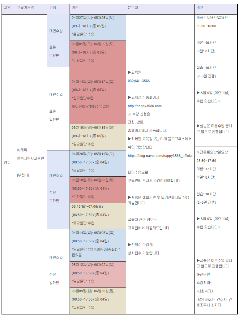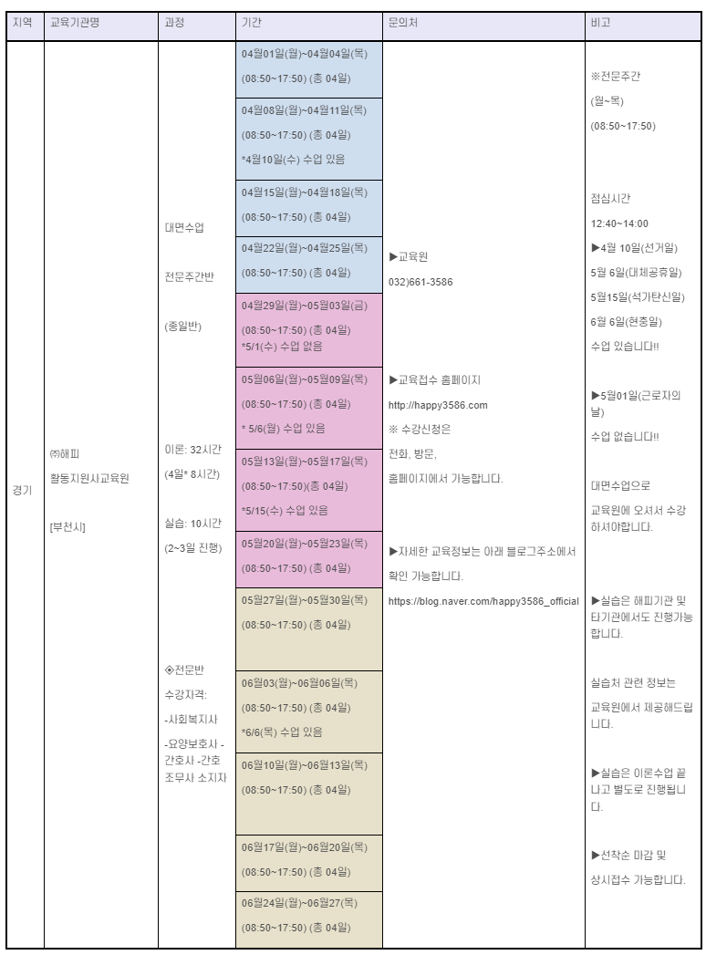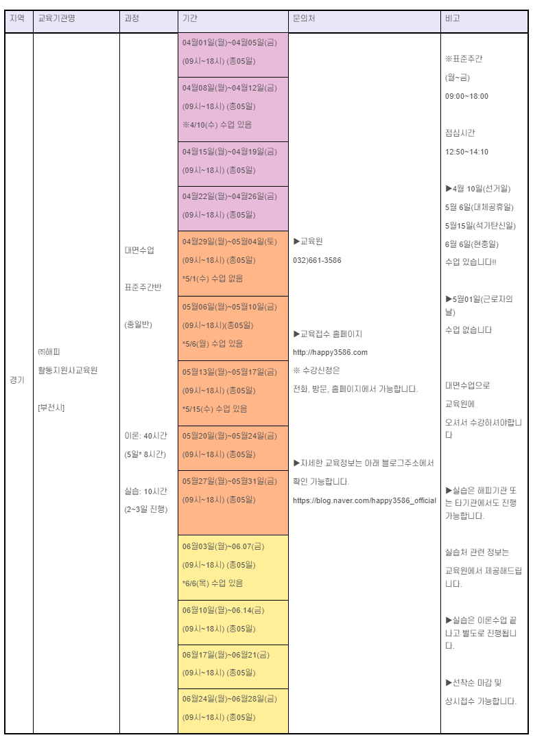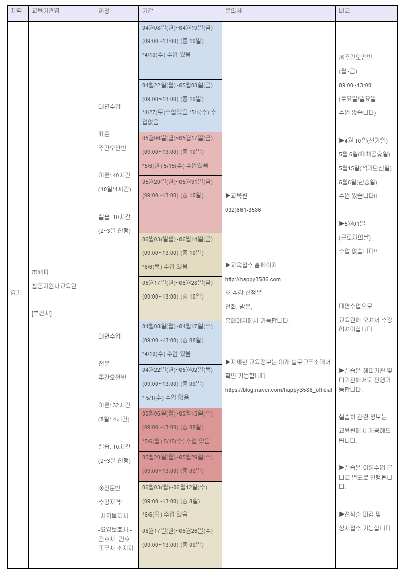 2024년 5월 경기도 소재 장애인활동지원사 교육기관의 교육 일정 모음이다. 해당 교육일정은 교육기관 홈페이지에서 발취했다.