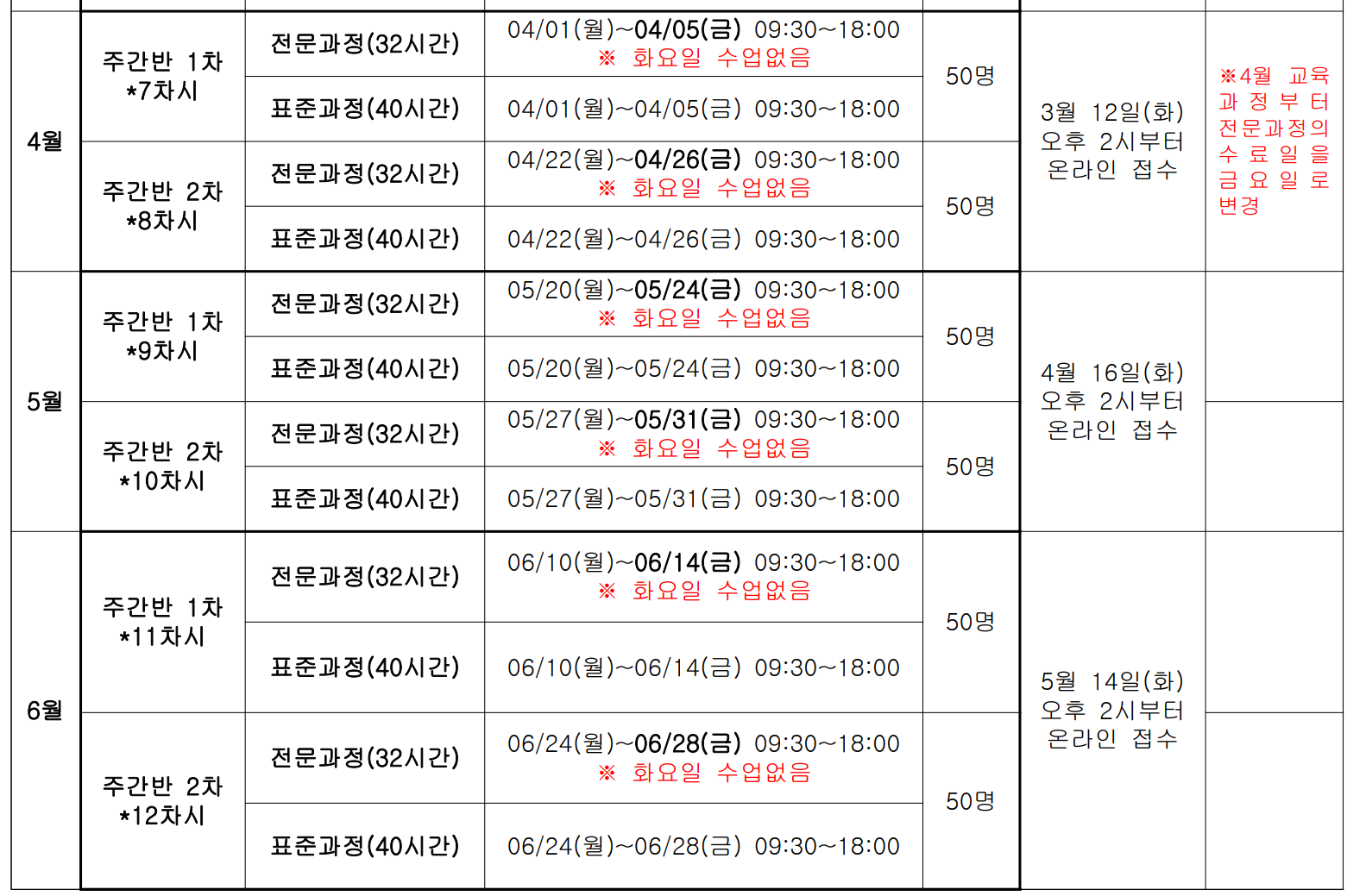 | 2024년 6월(주말8차) | 표준과정:6월 1일(토),2일(일),8일(토),9일(일),15일(토)/전문과정:6월 1일(토),2일(일),8일(토),15일(토) 접수 : 4.26.(금)09:00~ 선착순으로 마감함 |