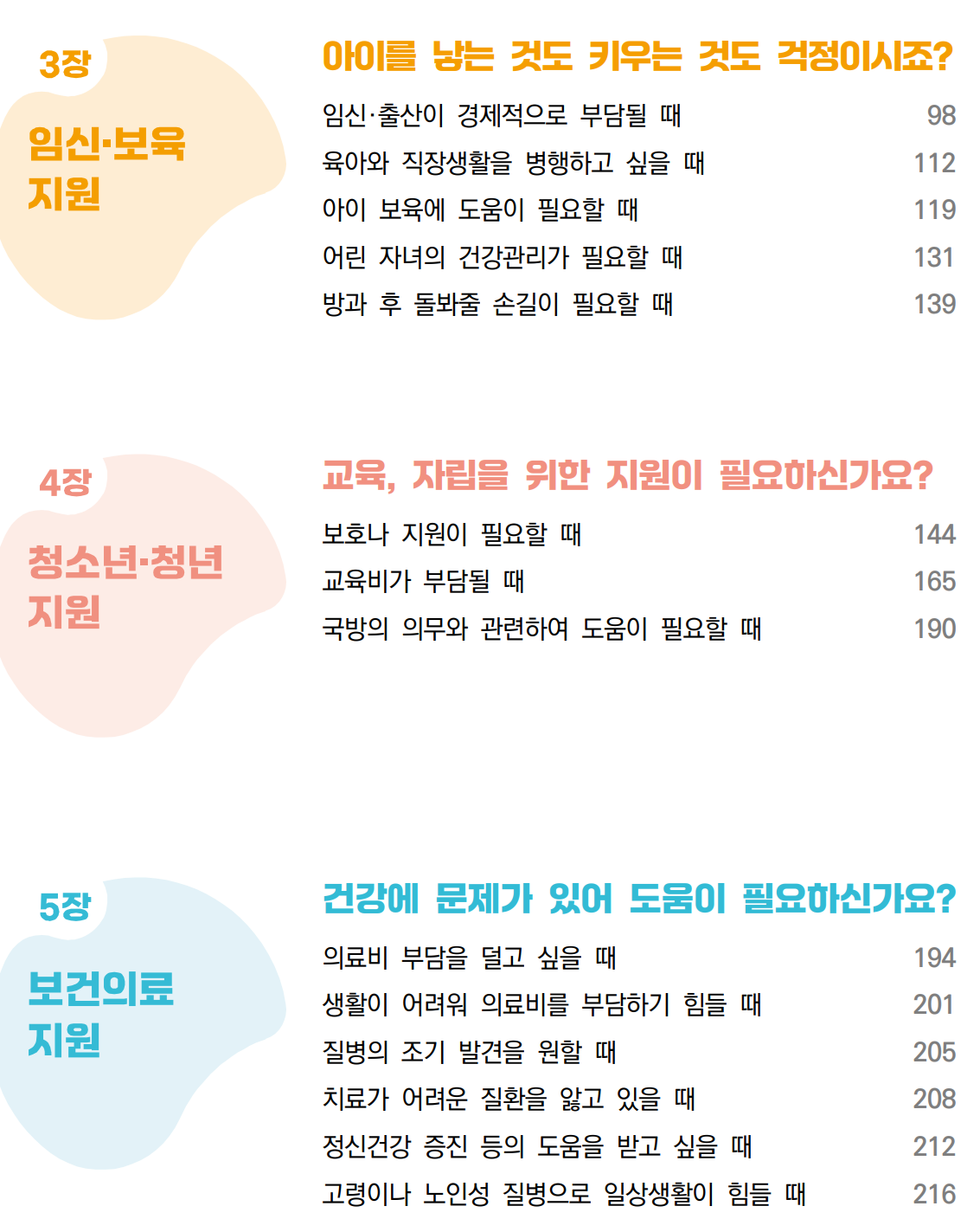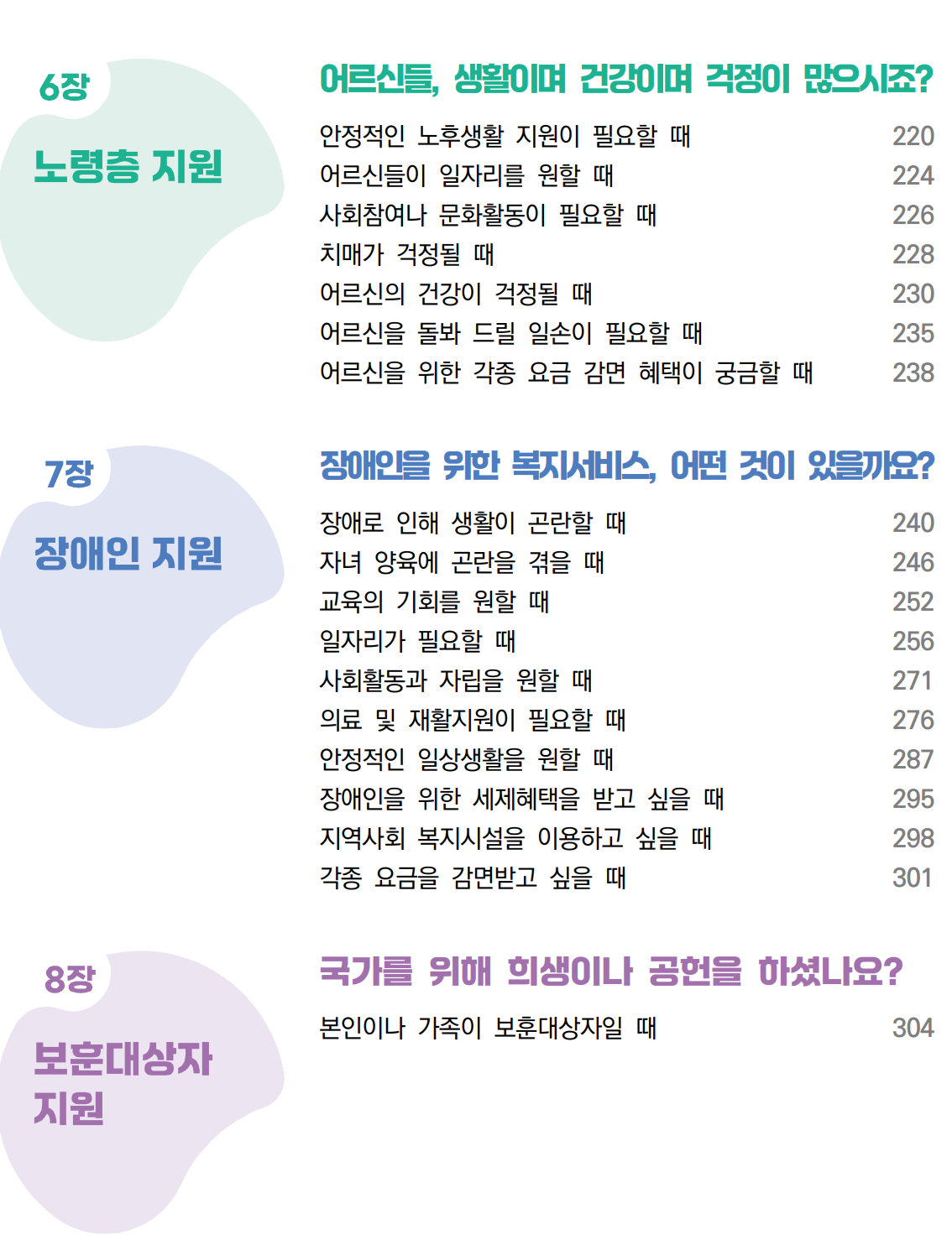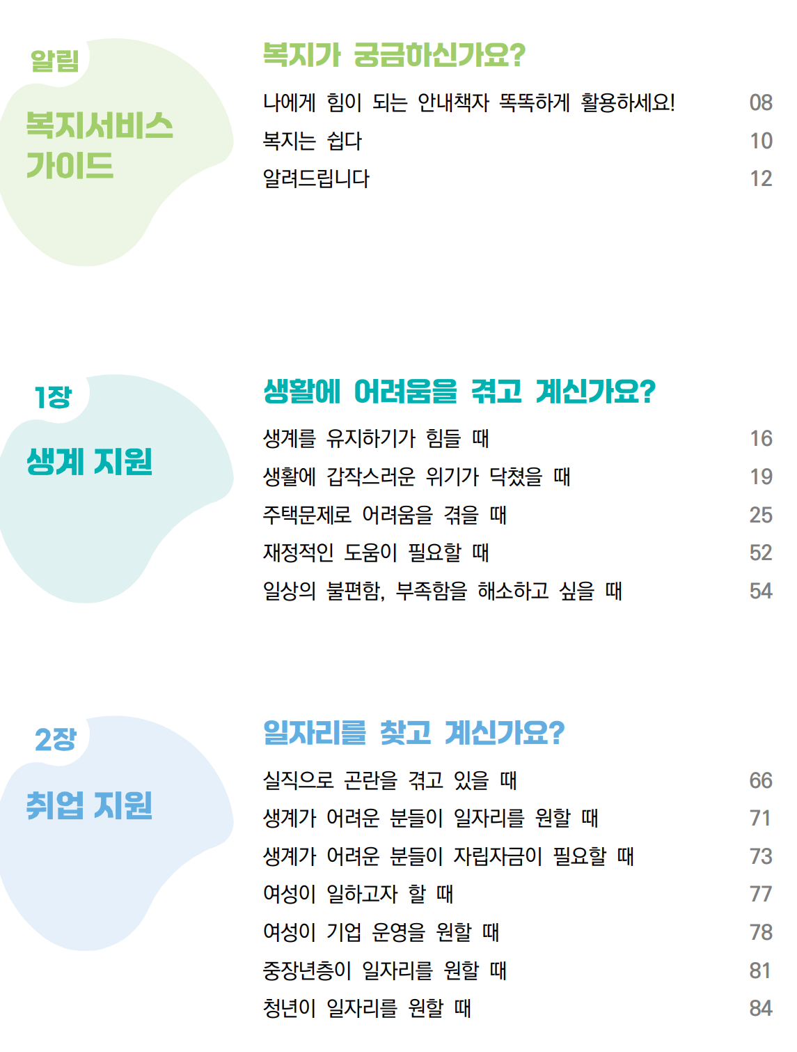 생계, 취업, 임신 및 보육, 청소년 및 청년, 보건의료, 노령층, 장애인, 보훈대상자, 법률 및 금융, 위기 상황별 지원 등 총 11장으로 구성되어 있다.