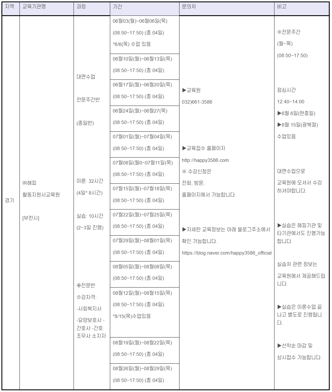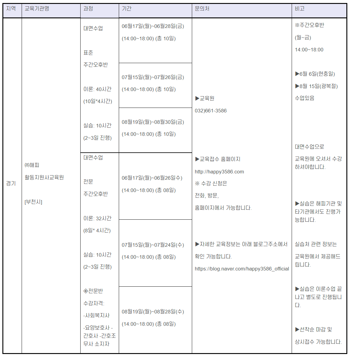 | 2024년 6월 전국 장애인활동지원사 양성 교육 일정 모음 (0) | 2024.06.12 |