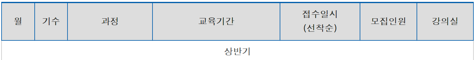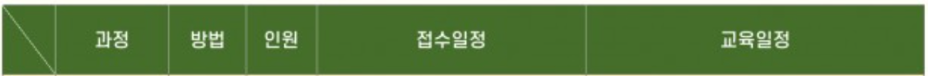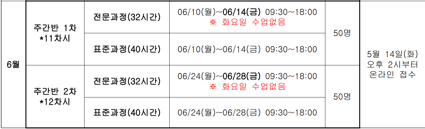 | 13회 | 토요반 6/1 6/8 6/15 6/22 6/29 일반교육 총 5일간 | 토요반 6/1 6/8 6/15 6/22 유사교육 총 4일간 |