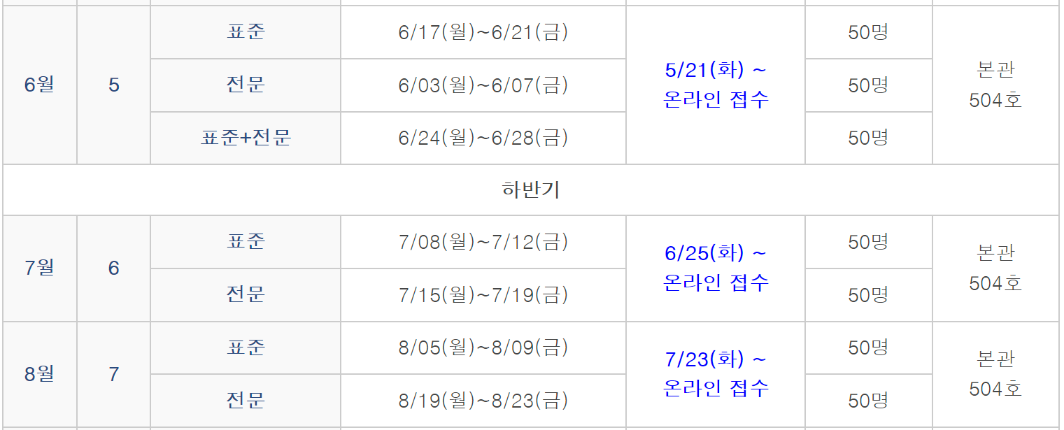 표준과정:7월15일(월)~19일(금) / 전문과정7월15일(월),16일(화),17일(수),19일(금) 접수 : 5.17.(금)09:00~ 선착순으로 마감함 |