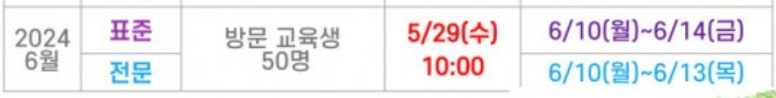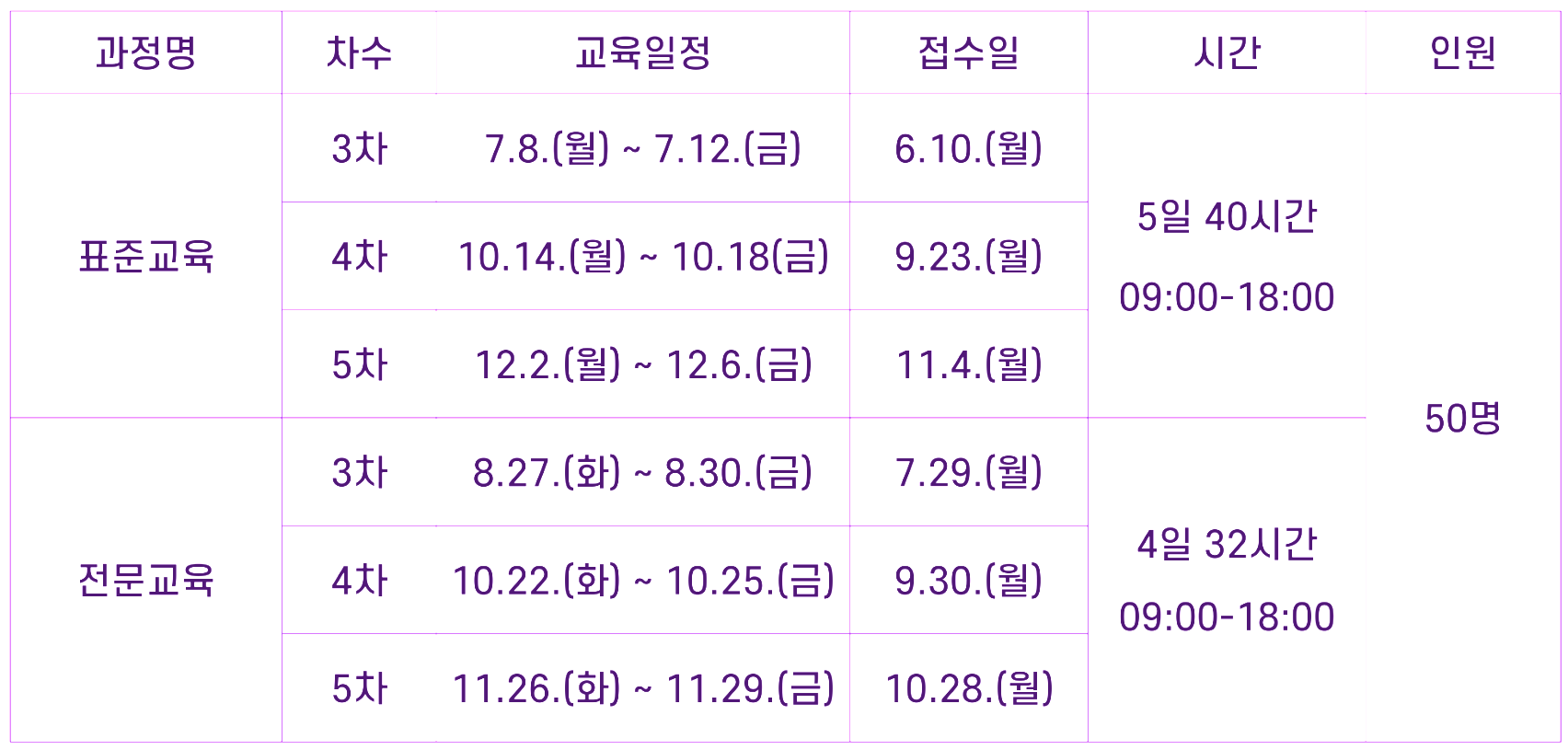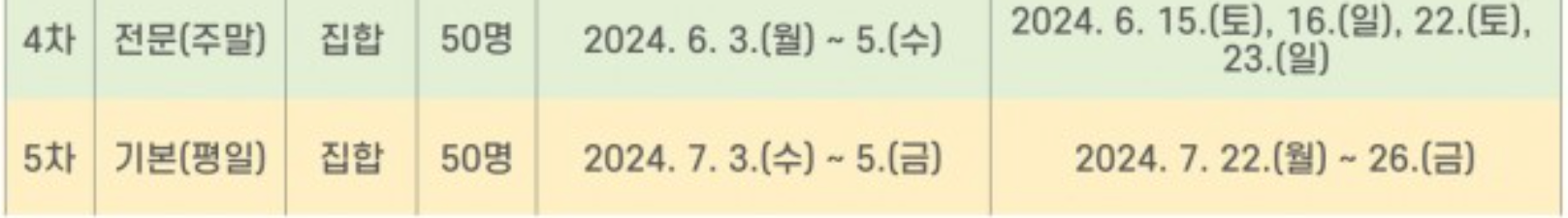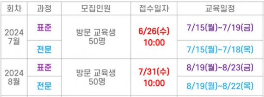 | 18회 | 토요반 7/13 7/20 7/27 8/3 8/10 일반교육 총 5일간 | 24년 07월 29(월)~08월 01일 (목) 총 4일간 |