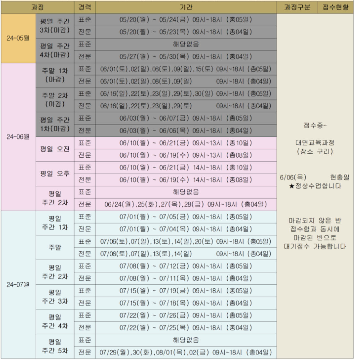 표준과정:6월 22일(토),23일(일),29일(토),30일(일),7월6일(토)/전문과정6월 22일(토),23일(일),29일(토),7월6일(토) 접수 : 5.17.(금)09:00~ 선착순으로 마감함 |