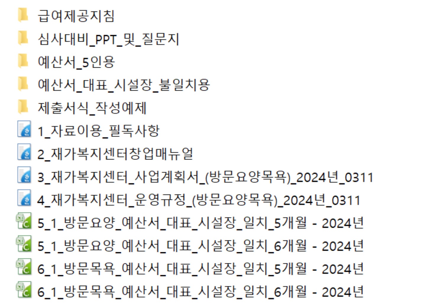 2024년 6월에 방문요양센터, 방문목욕 설립을 진행하시는 분들을 위한 사업계획서, 운영규정, 예산서 및 가족 양식 샘플이다.
