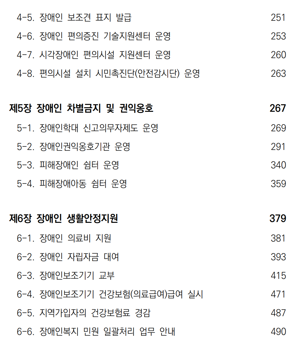 장애인 편의시설 설치 및 인증제, 장애인전용주차구역 운영, 장애인 보조기기 지원 등 편의증진 관련 사업도 다루고 있다. 아울러 장애인 차별금지와 권익옹호를 위한 신고의무자제도, 권익옹호기관 및 쉼터 운영에 대해 설명하고 있으며, 의료비 지원, 자립자금 대여 등 생활안정지원 사업도 포함되어 있다.