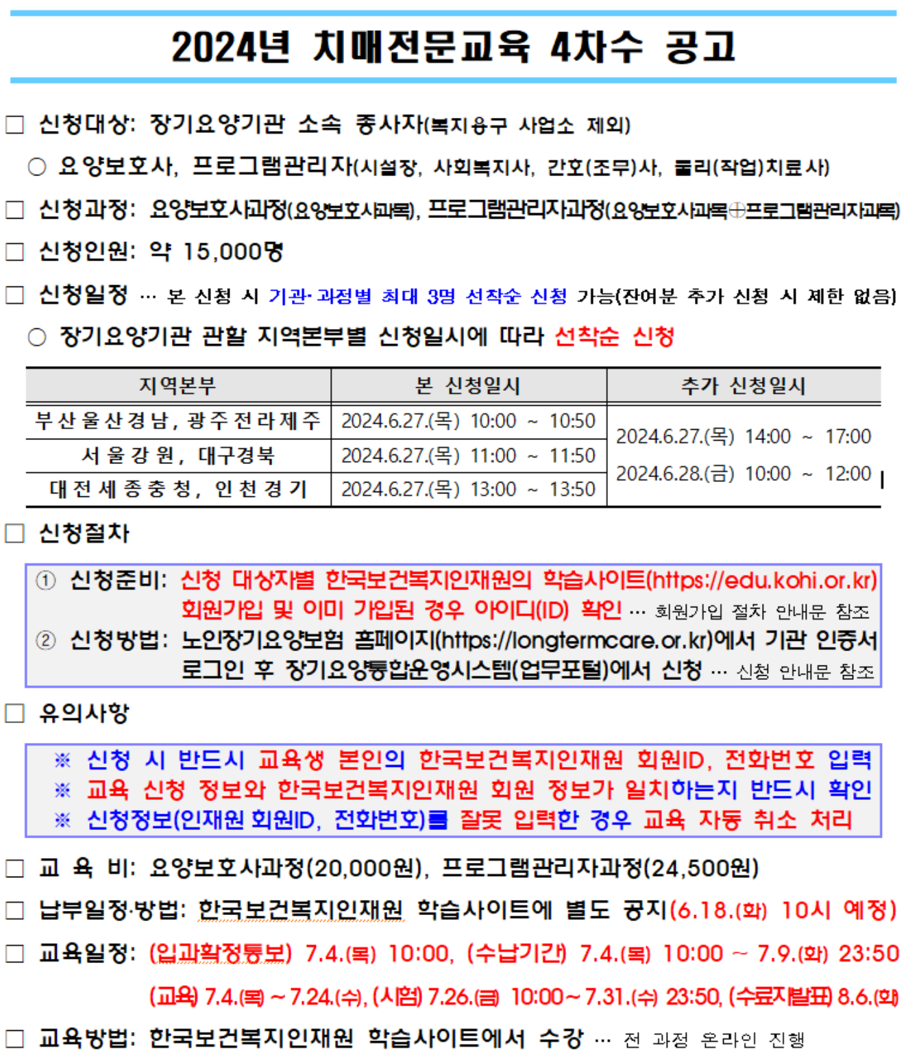 2024년 4차수 치매전문교육 공고가 떴습니다.치매전문교육은 온라인 과정으로 진행되며, 요양보호사, 간호(조무)사, 물..