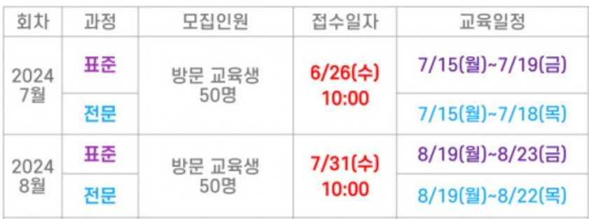 | 18회 | 토요반 7/13 7/20 7/27 8/3 8/10 일반교육 총 5일간 | 24년 07월 15(월)~07월 18일 (목) 총 4일간 |