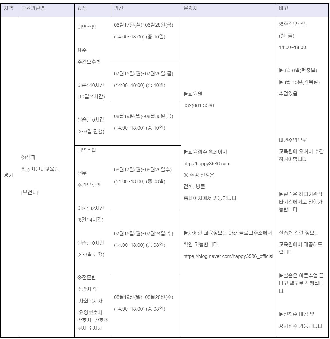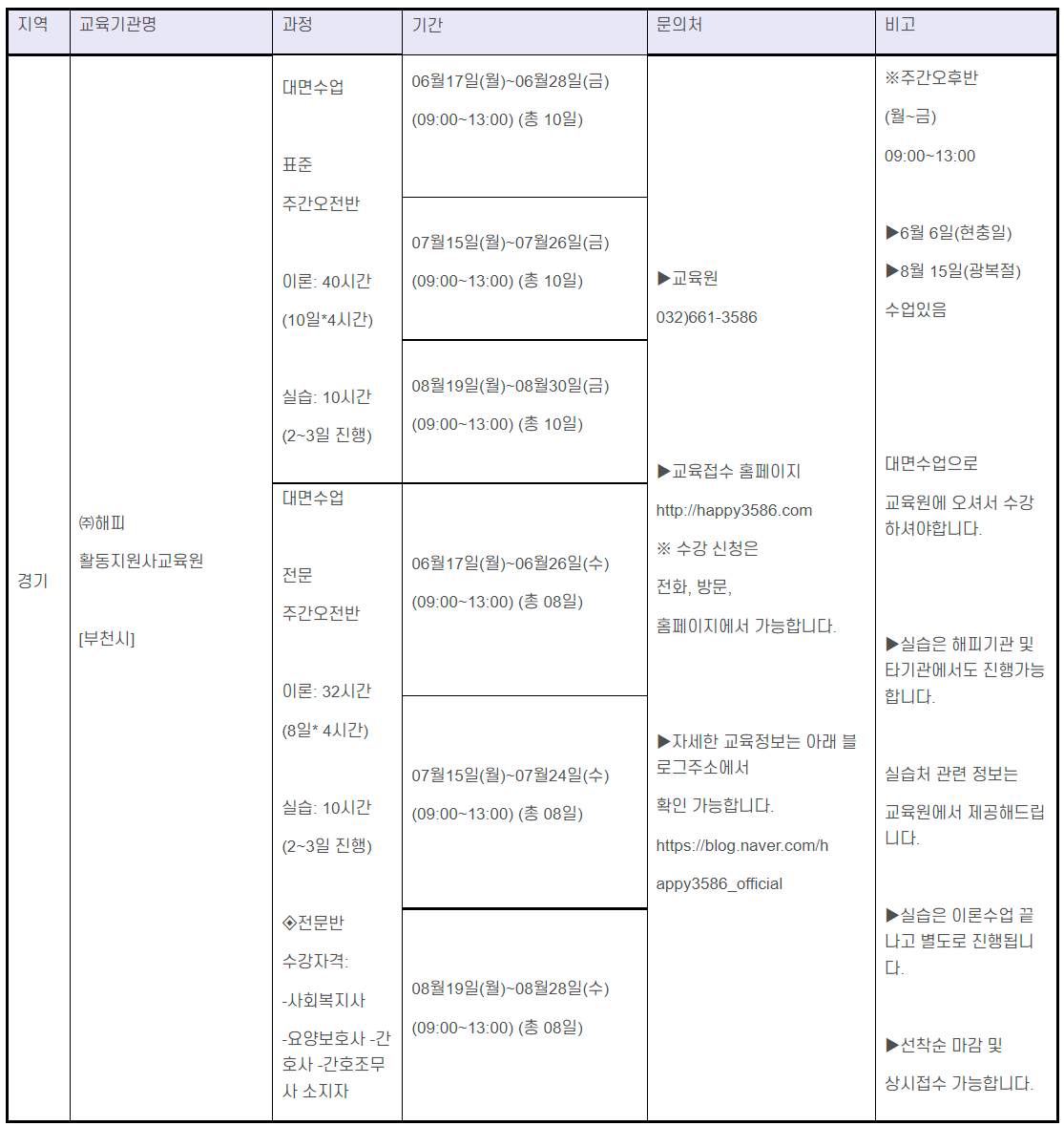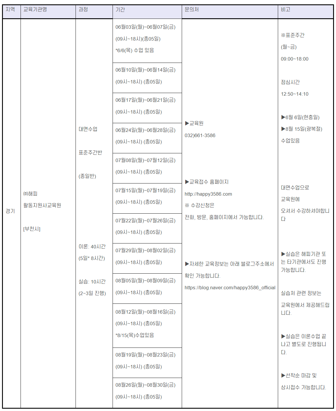 | 장애인활동지원사양성교육 | 2024년 6월(주말8차) | 표준과정:6월 1일(토),2일(일),8일(토),9일(일),15일(토)/전문과정:6월 1일(토),2일(일),8일(토),15일(토) 접수 : 4.26.(금)09:00~ 선착순으로 마감함 |