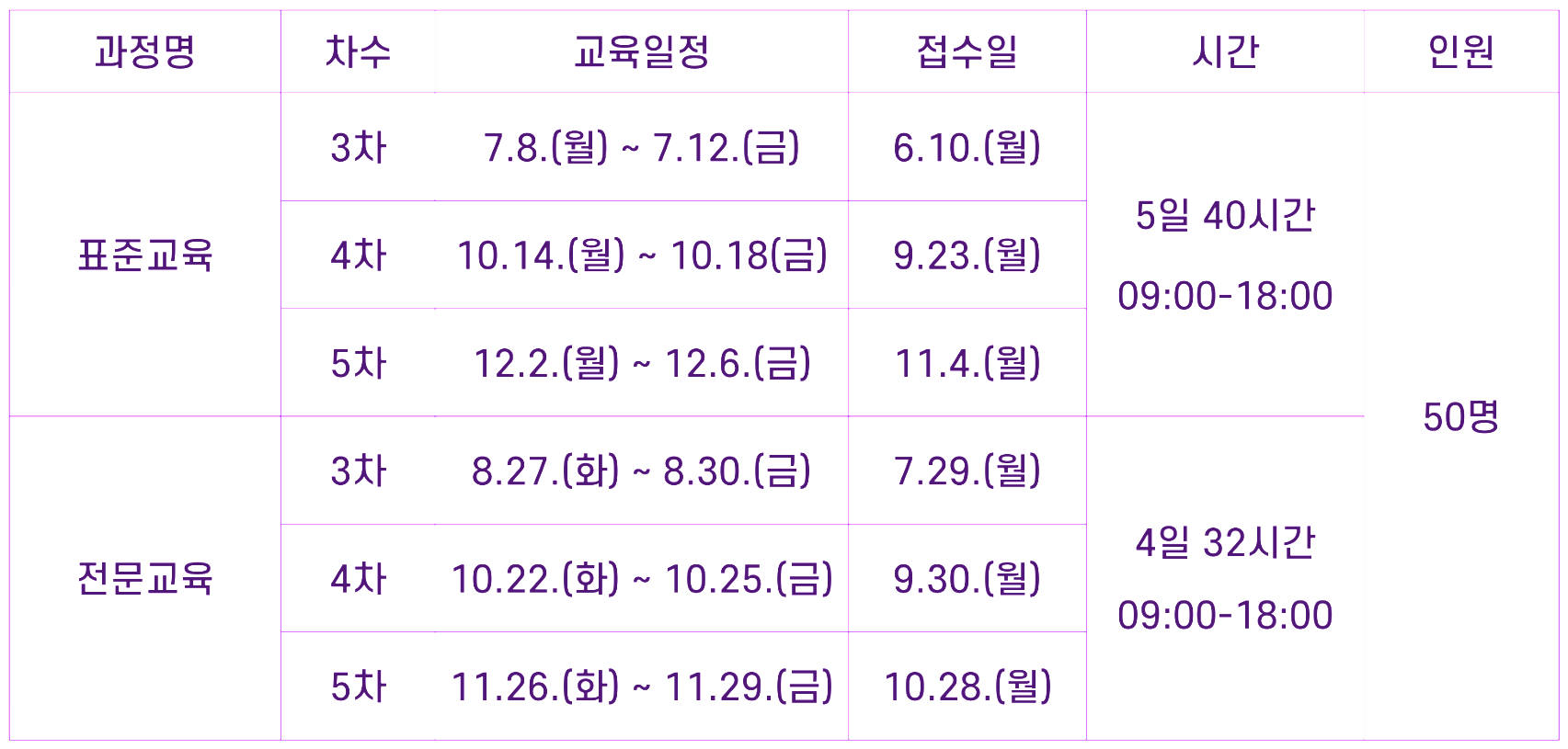 | 17회 | 2024년07월08일(월)~07월12일(금) 총 5일간 | 토요반 7/13 7/20 7/27 8/3 유사교육 총 4일간 |