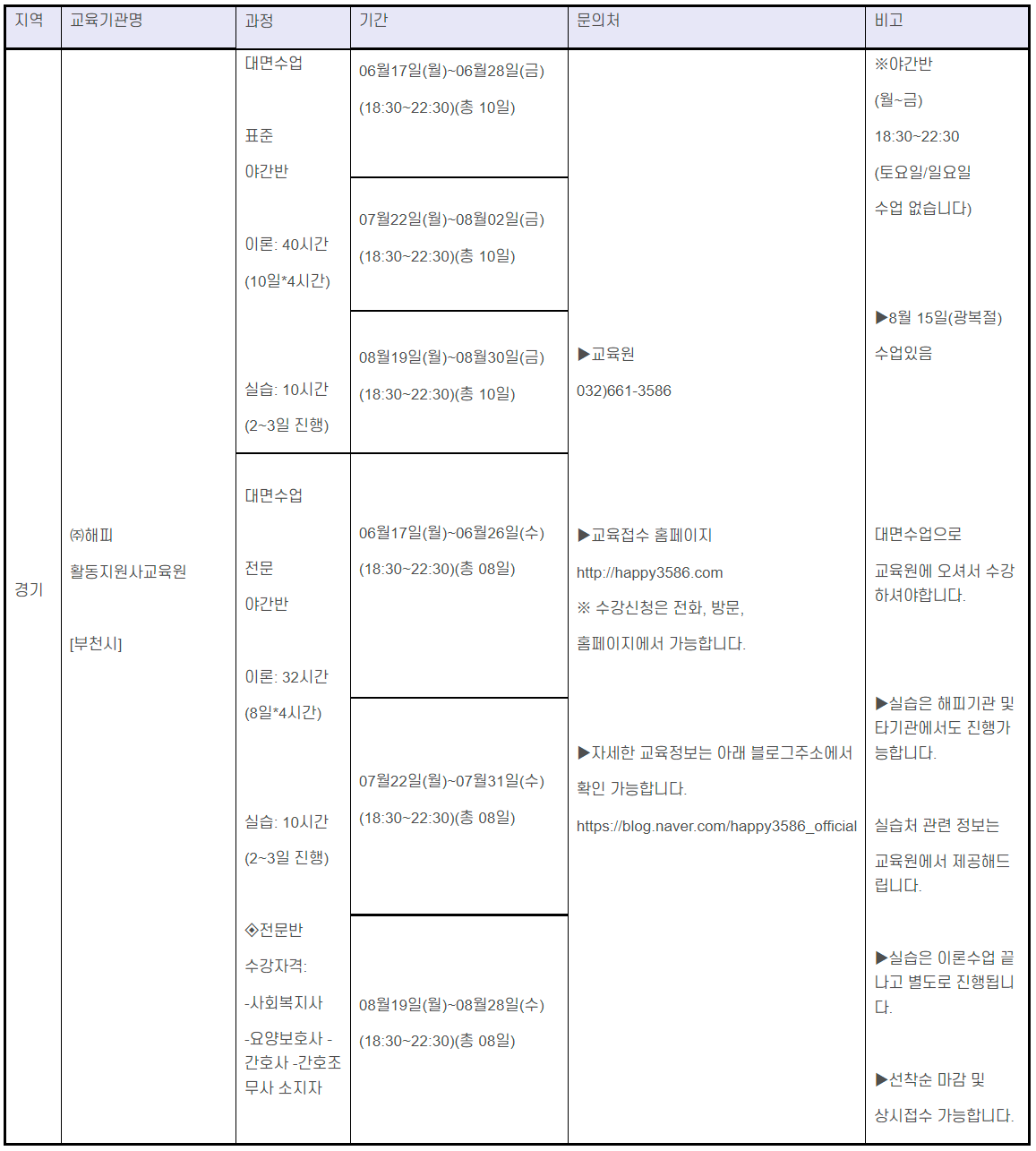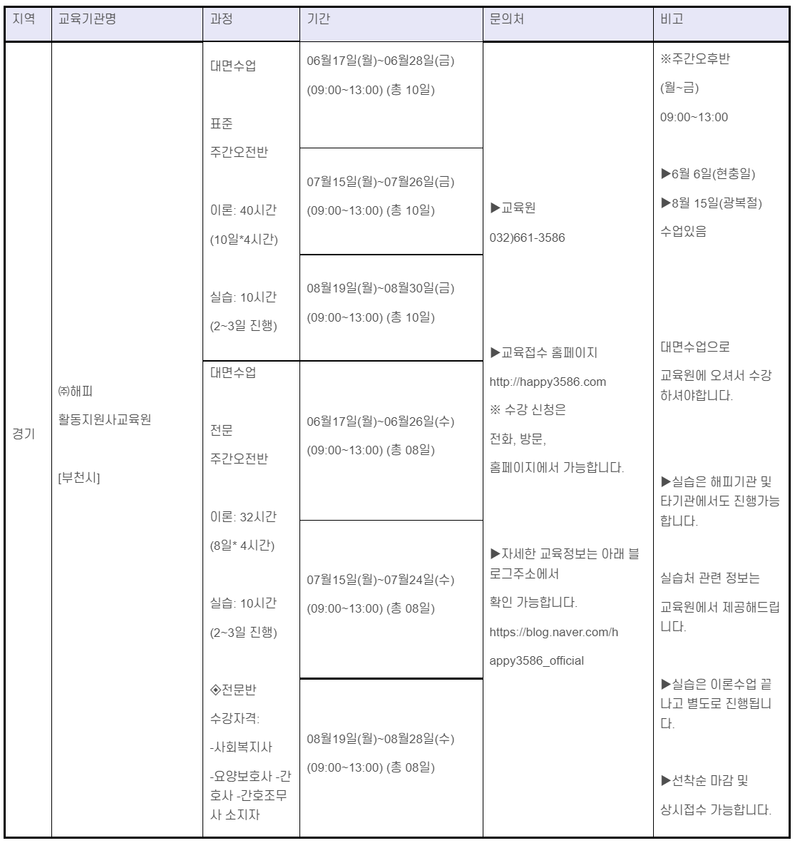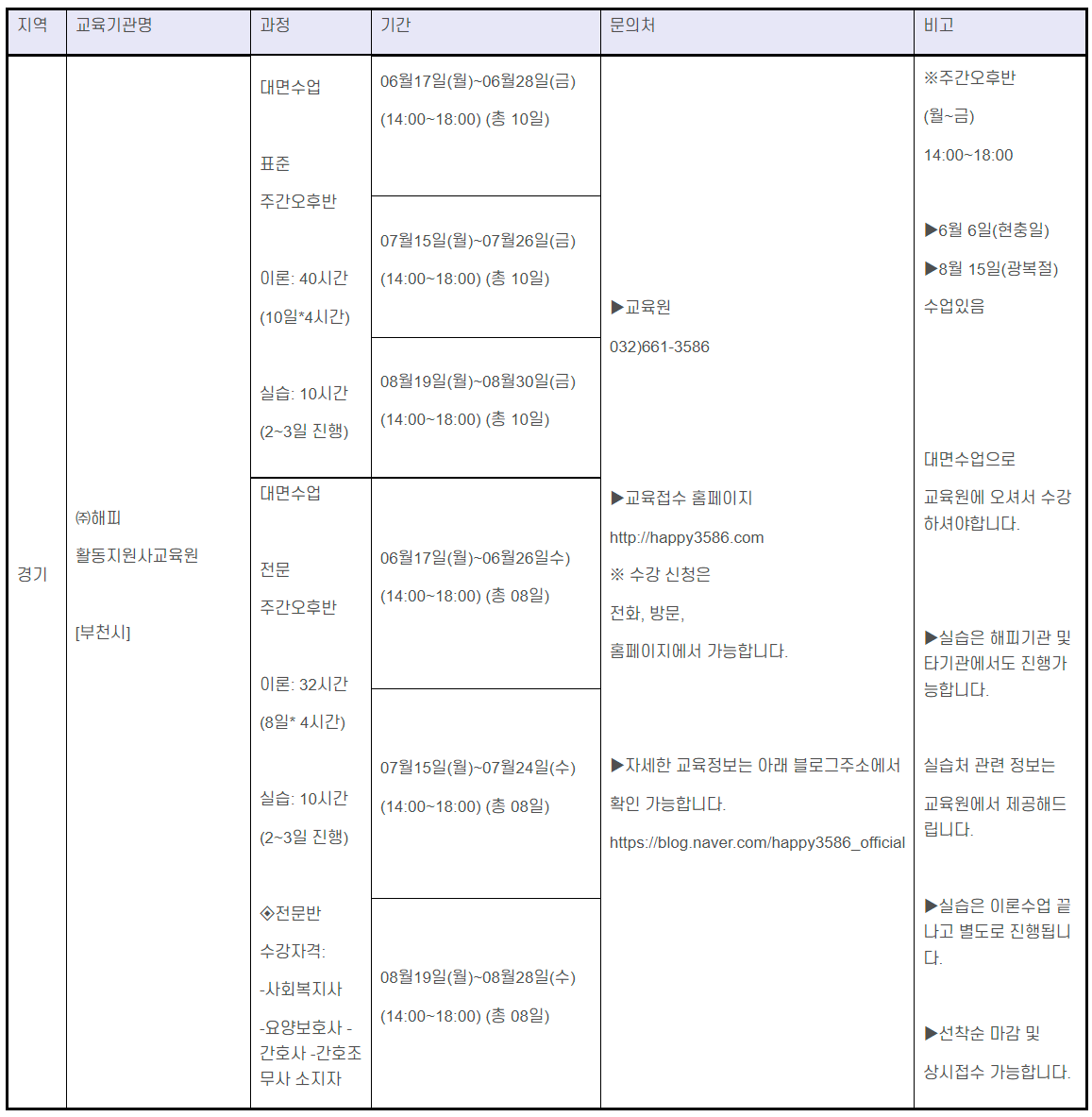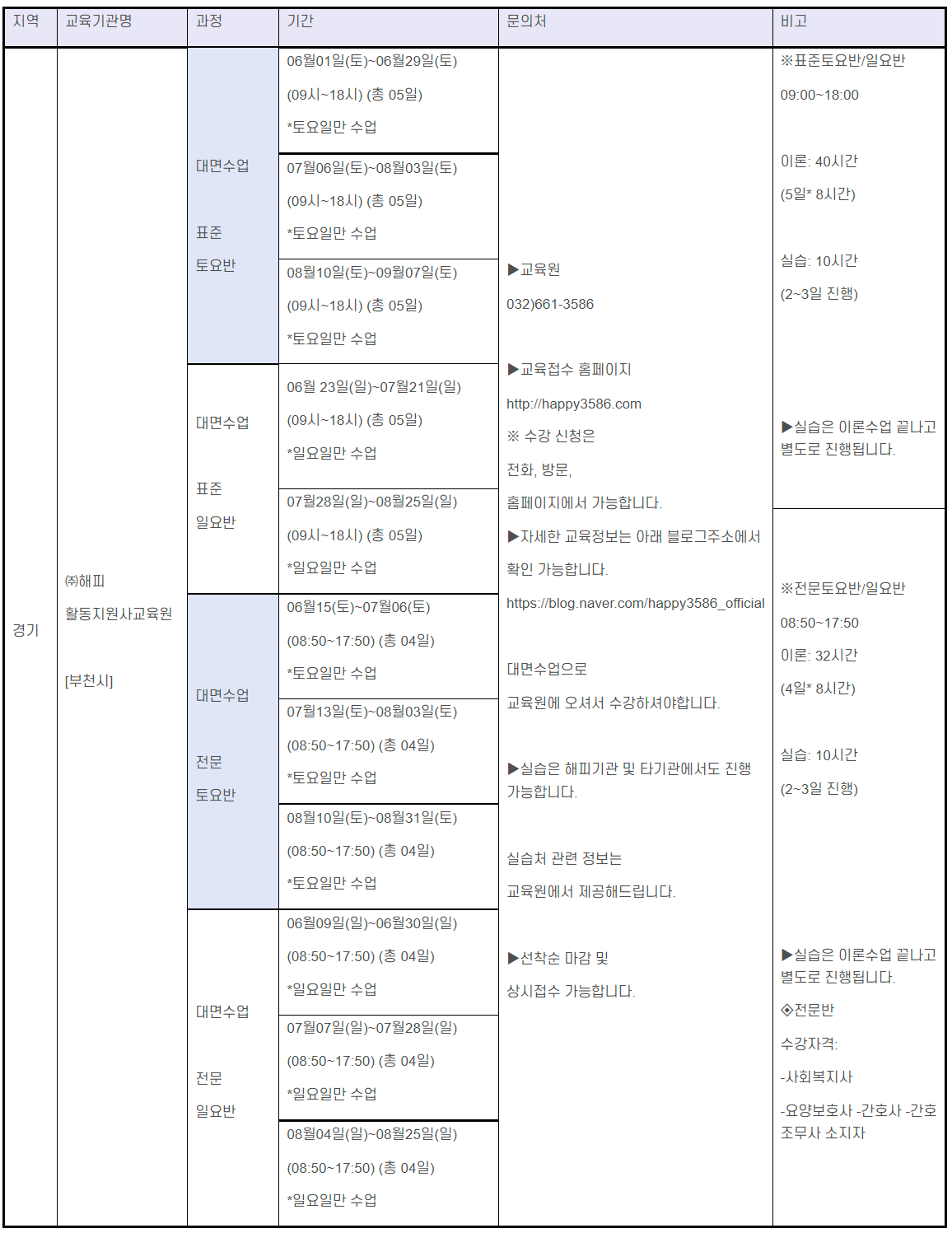 | 장애인활동지원사양성교육 | 2024년 6월(주말8차) | 표준과정:6월 1일(토),2일(일),8일(토),9일(일),15일(토)/전문과정:6월 1일(토),2일(일),8일(토),15일(토) 접수 : 4.26.(금)09:00~ 선착순으로 마감함 |