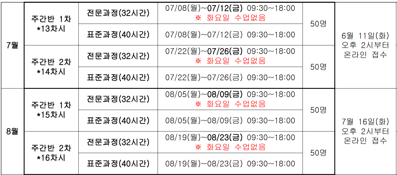 | 7월 | 표준 | 7/08(월)~7/12(금) | 6/25(화) ~ 온라인 접수 |