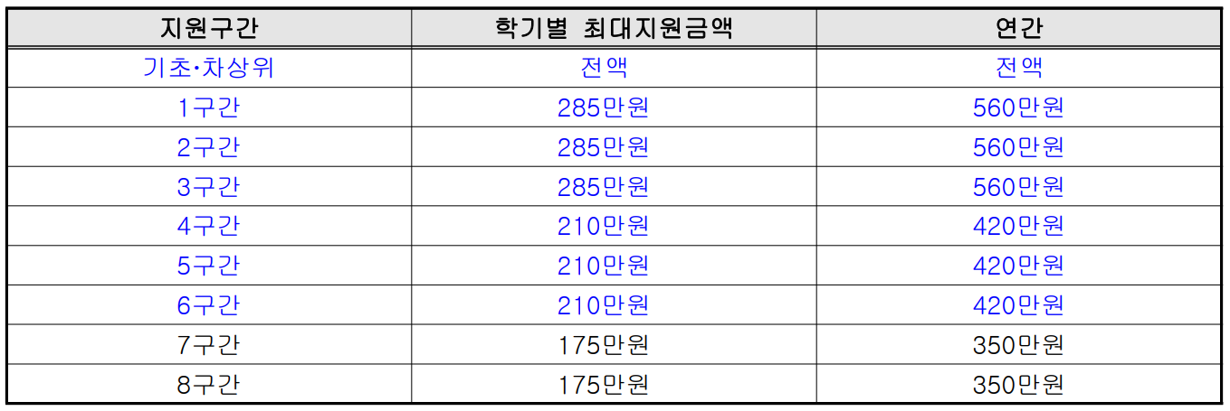 2024년 국가장학금 Ⅰ유형 지원구간별 연간 지원금액
