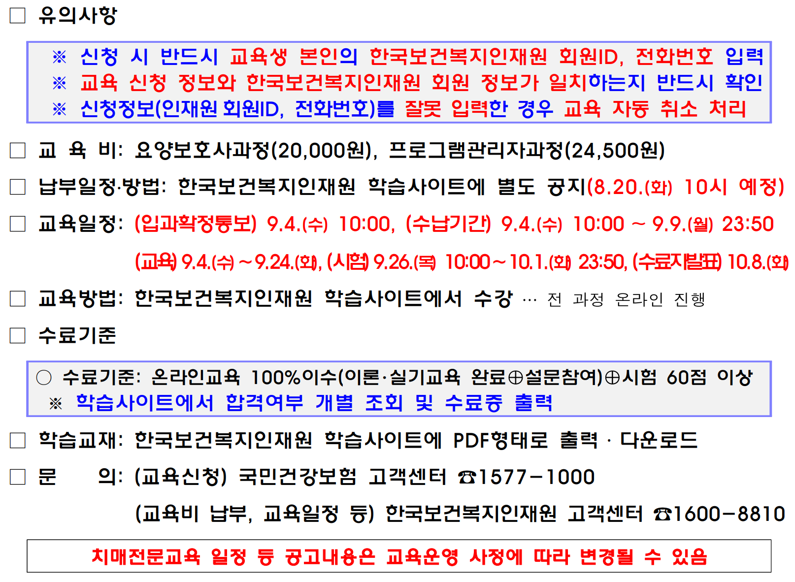 | 2024년 치매전문교육 4차수 교육 공고 ( 요양보호사 등 장기요양기관 종사자 등 ) (0) | 2024.06.17 |