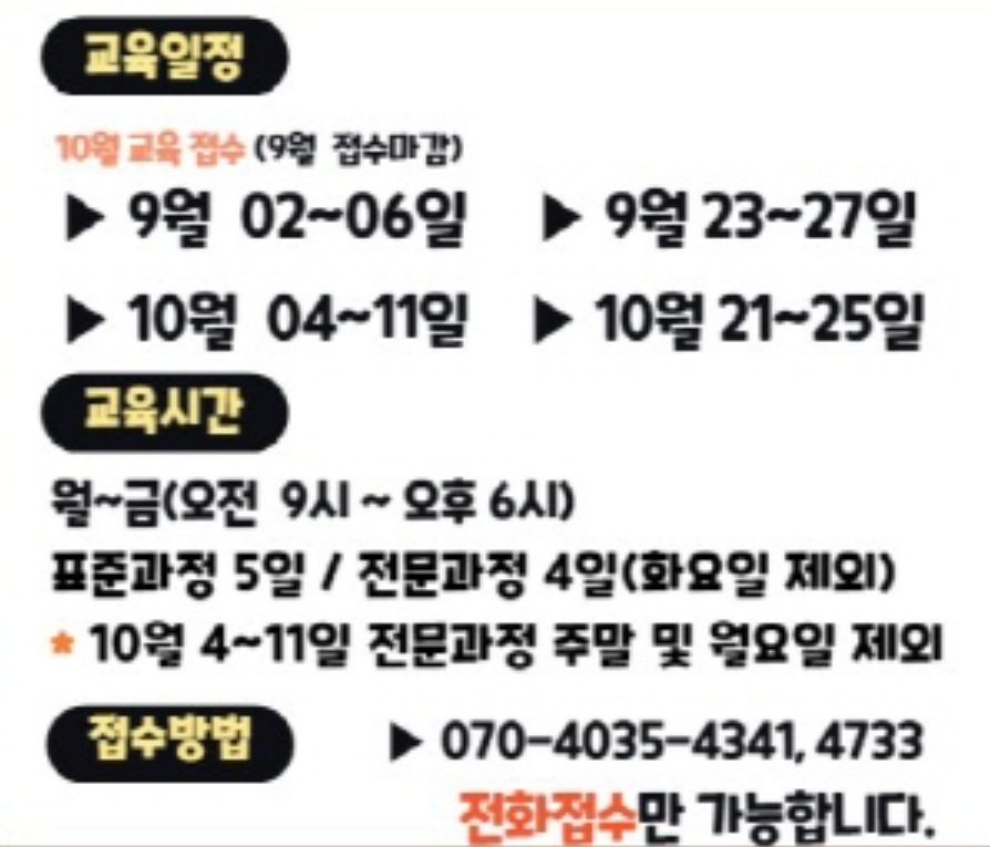 | 신규 평일반 | 17차 | 40 | 2024년 09월 23(월)~ 09월 27(금) (5일간 오전 9시 ~ 오후 6시) |