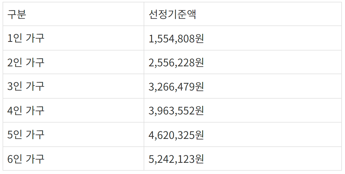소득인정액이 아래의 선정기준액 이하이어야 지원을 받을 수 있다.