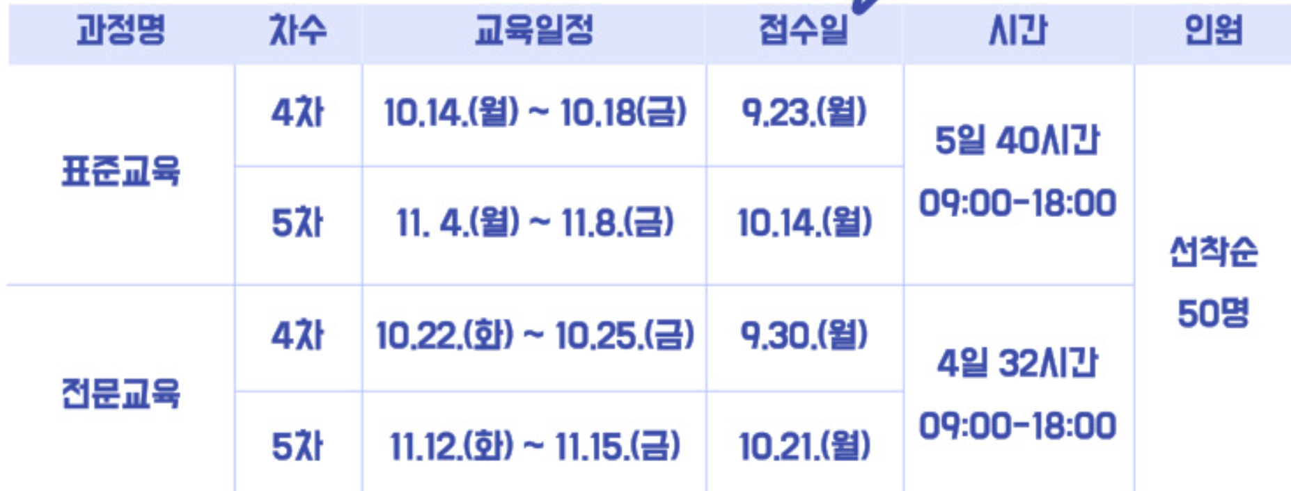 | 28회 | 토요반 11/9 11/16 11/23 11/30 12/7 일반교육 총 5일간 | 토요반 11/9 11/16 11/23 11/30 유사교육 총 4일간 |