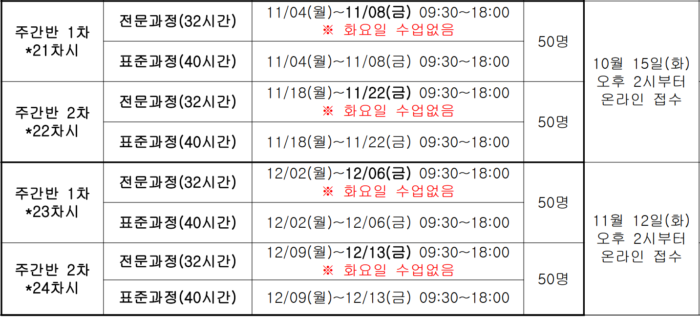 표준과정:11월2일(토),3일(일),9일(토),10일(일),16일(토)/전문과정:11월2일(토),3일(일),9일(토),16일(토) 접수 : 9.30.(월)09:00~ 선착순으로 마감함 |