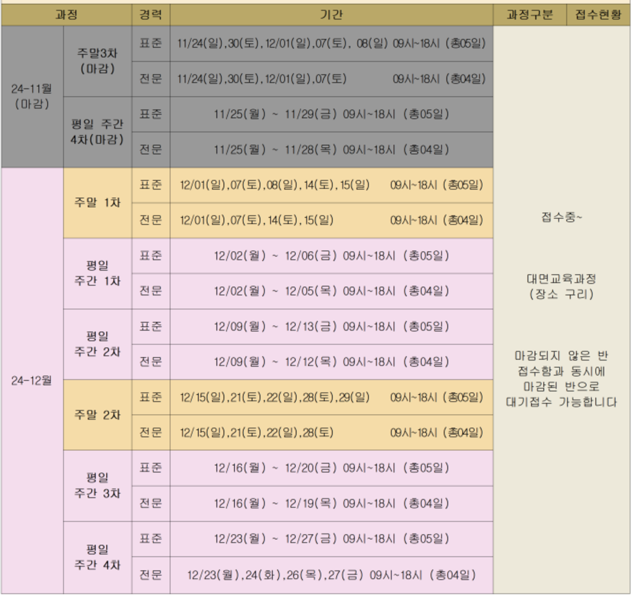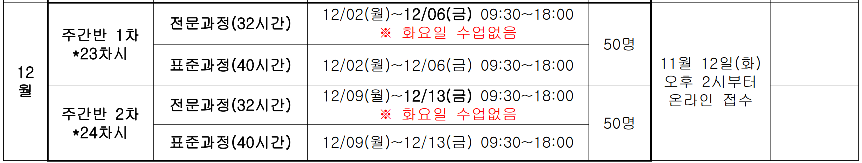 표준과정:12월 14일(토),15일(일),21일(토),22일(일),28일(토) / 전문과정:12월14일(토),15일(일),21일(토),28일(토) 접수 : 11.13.(수)09:00~ 선착순으로 마감함 |