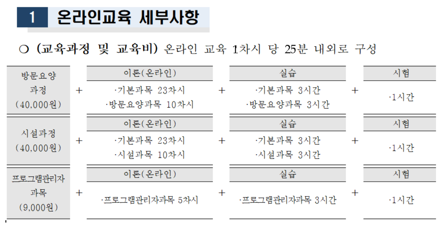 - 프로그램관리자과정의 경우 수강 순서에 상관없이 방문요양 또는 시설 과정과 프로그램관리자 과목 각각 신청