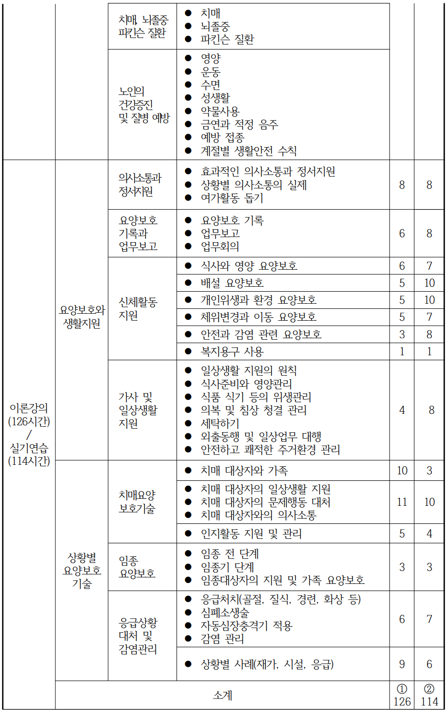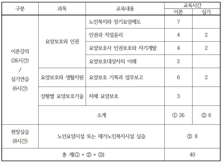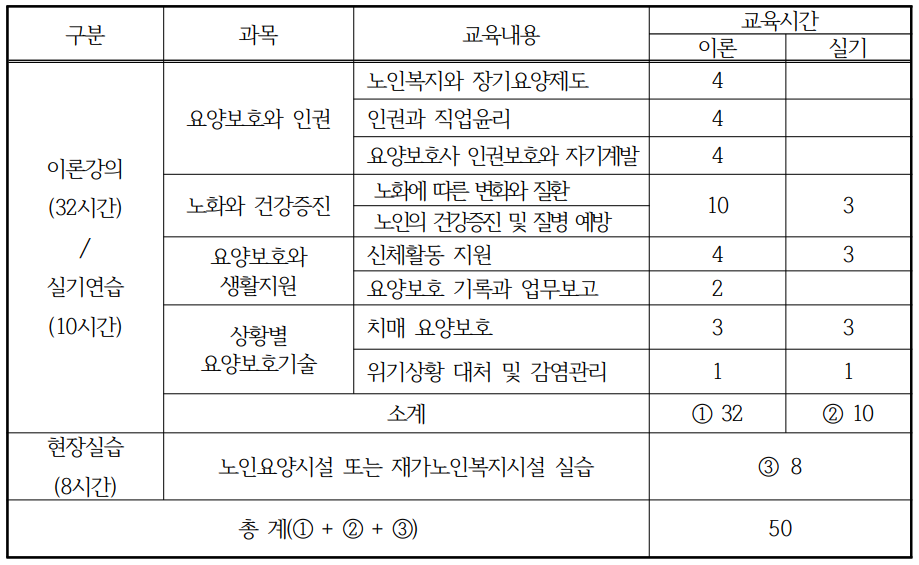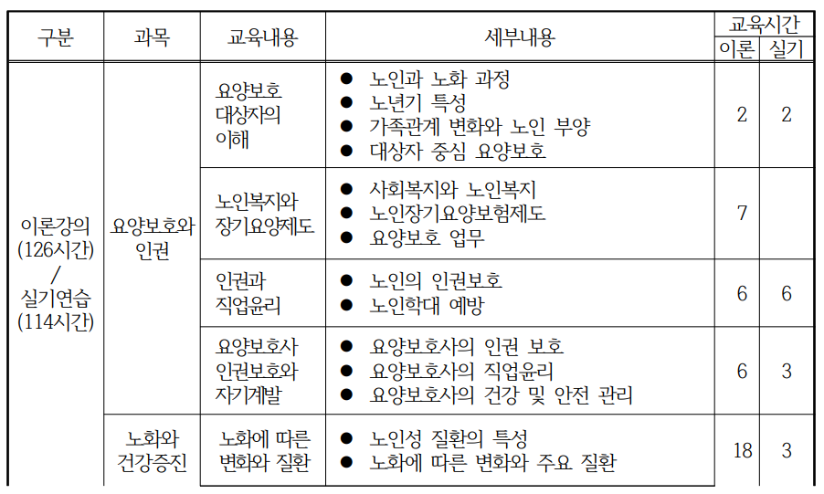 요양보호와 인권, 노화와 건강증진, 요양보호와 생활지원, 상황별 요양보호기술 등에 대한 과목과 각 교육내용, 세부내용으로 이론과 실기를 학습하게 된다.