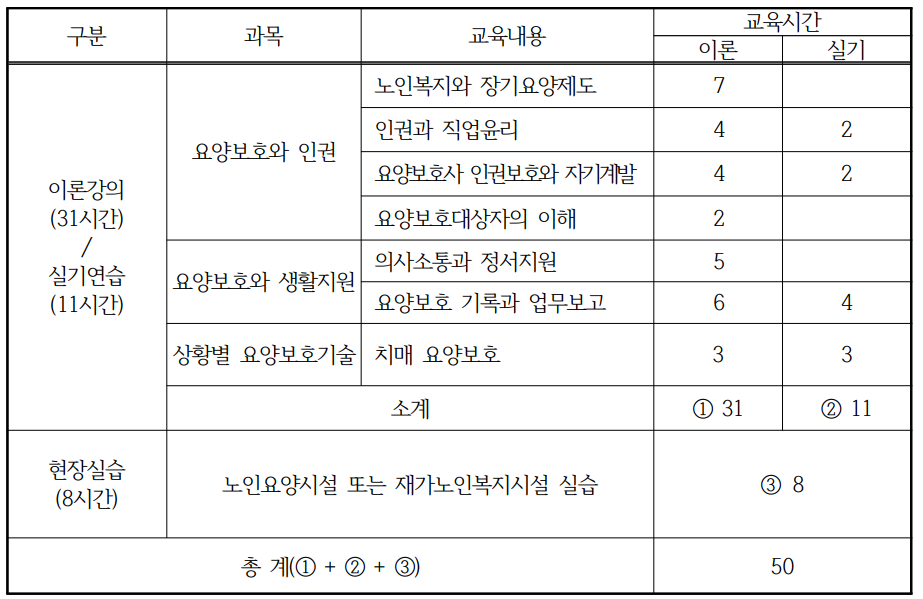 요양보호와 인권, 노화와 건강증진, 요양보호와 생활지원, 상황별 요양보호기술 등에 대한 과목과 각 교육내용, 세부내용으로 이론과 실기를 학습하게 된다.