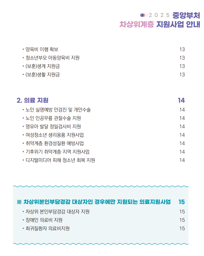 아래 자료는 2025년 중앙부처 차상위계층 지원 사업 안내 자료로서 지원하는 종류와 신청 대상, 신청 방법을 소개하고 있다.