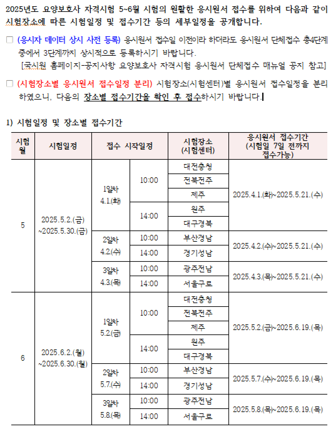 요양보호사 자격 시험은 응시원서의 원활한 접수를 위해 사전 안내하고 있다. 아래는 2025년 5~6월 응시원서 접수 안내이다. 전체 일정을 확인하고 싶으면 아래의 시험 일정 전용 페이지를 확인해 보자.