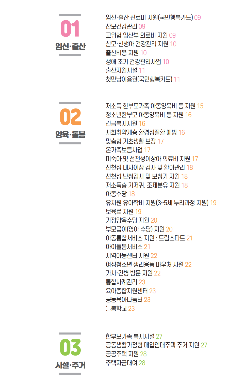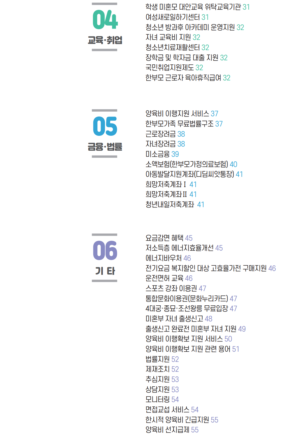 2025년 한부모가족 복지서비스 종합안내서에는 임신·출산 지원부터 양육·돌봄, 주거, 교육·취업, 금융·법률, 기타 생활 지원까..
