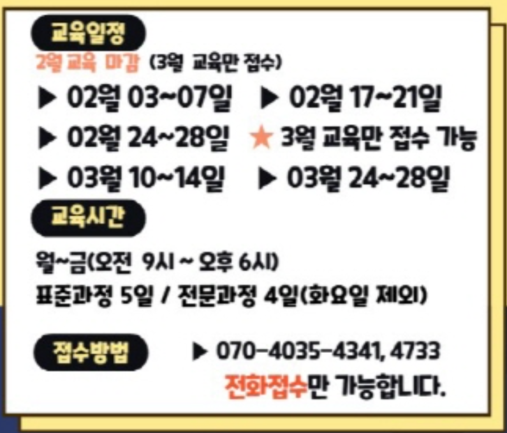 | 신규 평일반 | 6차 | 40 | 2025년 3월 24(월)~ 3월 28(금) (5일간 오전 9시 ~ 오후 6시) |