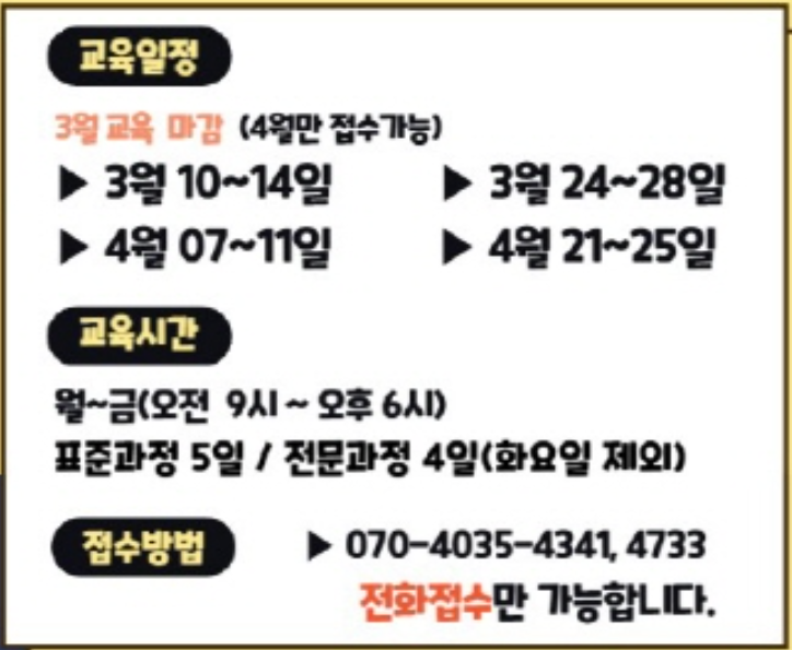 | 신규 평일반 | 7차 | 40 | 2025년 4월 21(월)~ 4월 25(금) (5일간 오전 9시 ~ 오후 6시) |