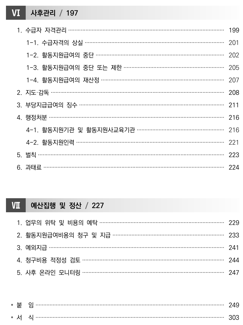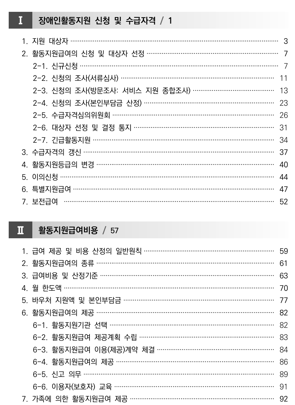 2025년 장애인활동지원 사업안내는 1장에서는 장애인활동지원 서비스 지원 대상자를 선정하고, 신청 절차 및 조사 과정을 통해 대상자를 결정하는 방법을 설명한다. 본인부담금 산정, 긴급활동지원, 자격 갱신 및 등급 변경 등도 포함된다.