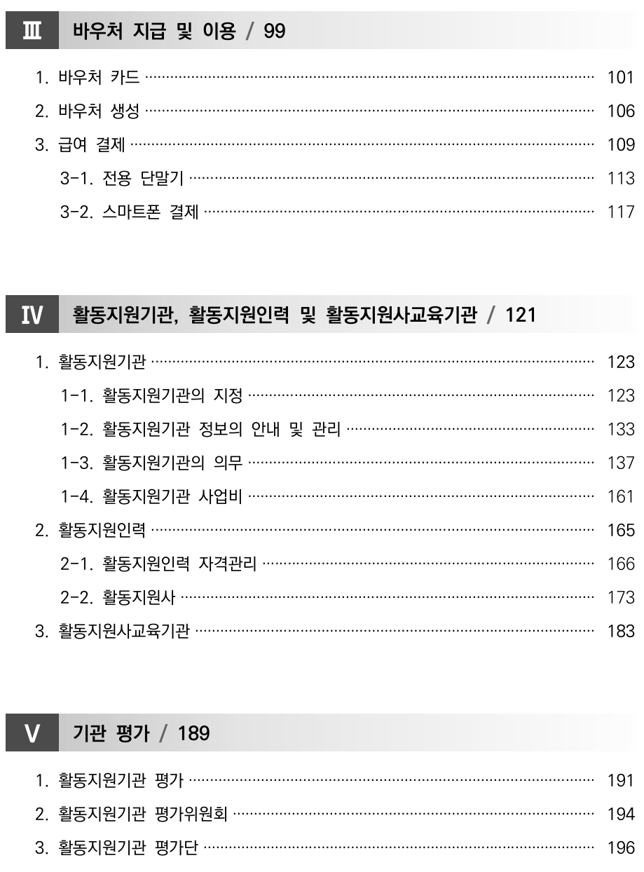 그외에 바우처 카드 발급, 생성 및 급여 결제 방식에 대해 구체적으로 설명하며, 활동지원기관, 활동지원인력 및 활동지원사 교육기기관의 지정 및 관리, 활동지원사의 자격 및 교육기관에 대한 내용이 포함되며, 기관의 의무와 사업비를 다룬다.