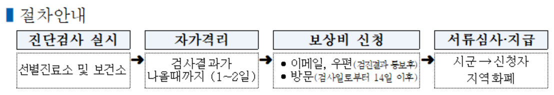 (의료진 소견 없이 진단검사를 받은 경우 보상금 지원대상이 아니며 진단검사비도 본인이 부담)