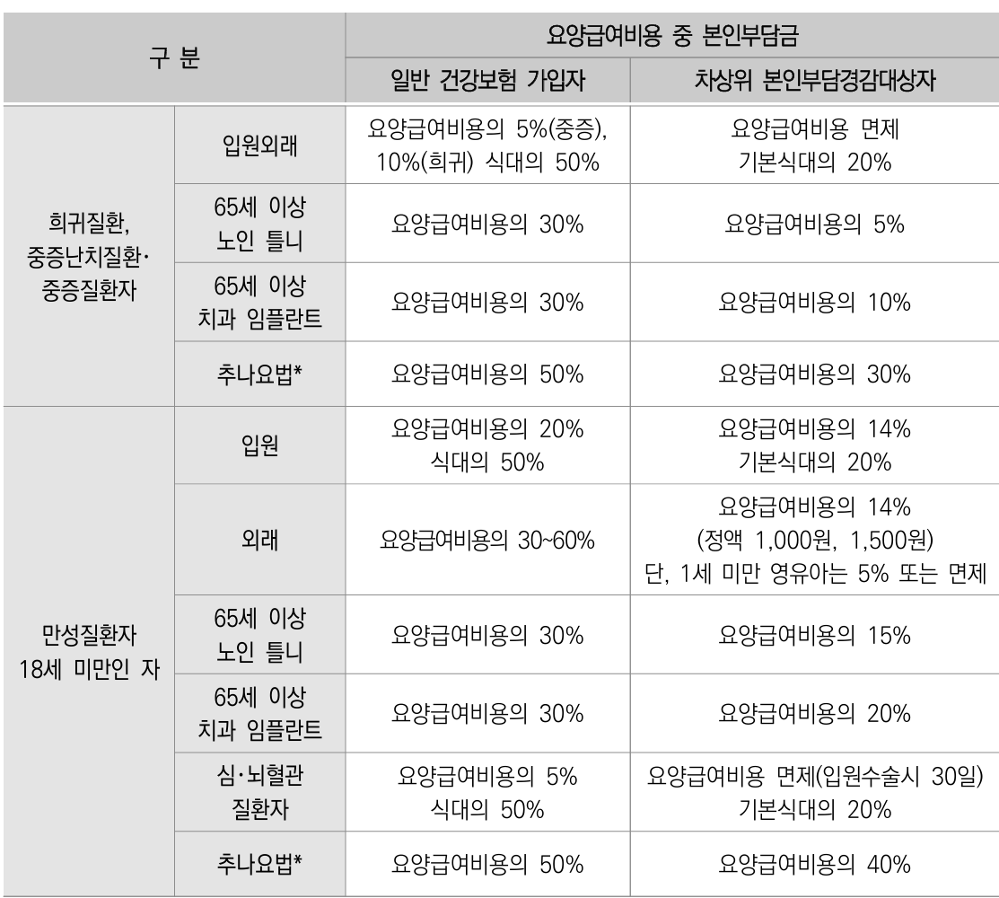 차상위 본인부담경감대상자 지원사업은 희귀질환, 중증난치질환, 중증질환을 앓고 있는 환자들 중에서 6개월 이상 치료를 받고 있거나 치료가 필요한 사람, 또는 18세 미만 아동을 대상으로 한다. 대상자의 가구 소득이 기준 중위소득의 50% 이하이며, 부양 요건을 충족할 경우, 요양급여비용 중 본인이 부담해야 하는 금액을 경감해주는 제도이다.
