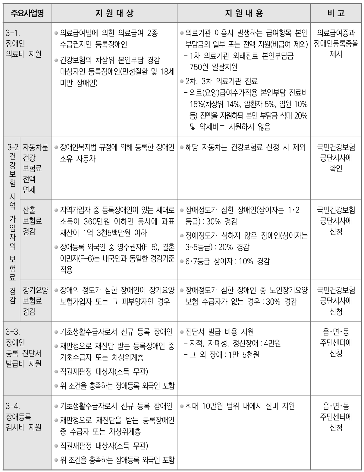 장애인에게는 의료급여 2종 서비스를 제공하고 차상위계층일 경우 본인부담금 경감 대상 지원을 한다. 그외에 보험료 경감, 진단서 발급비, 검사비 등을 지원한다.
