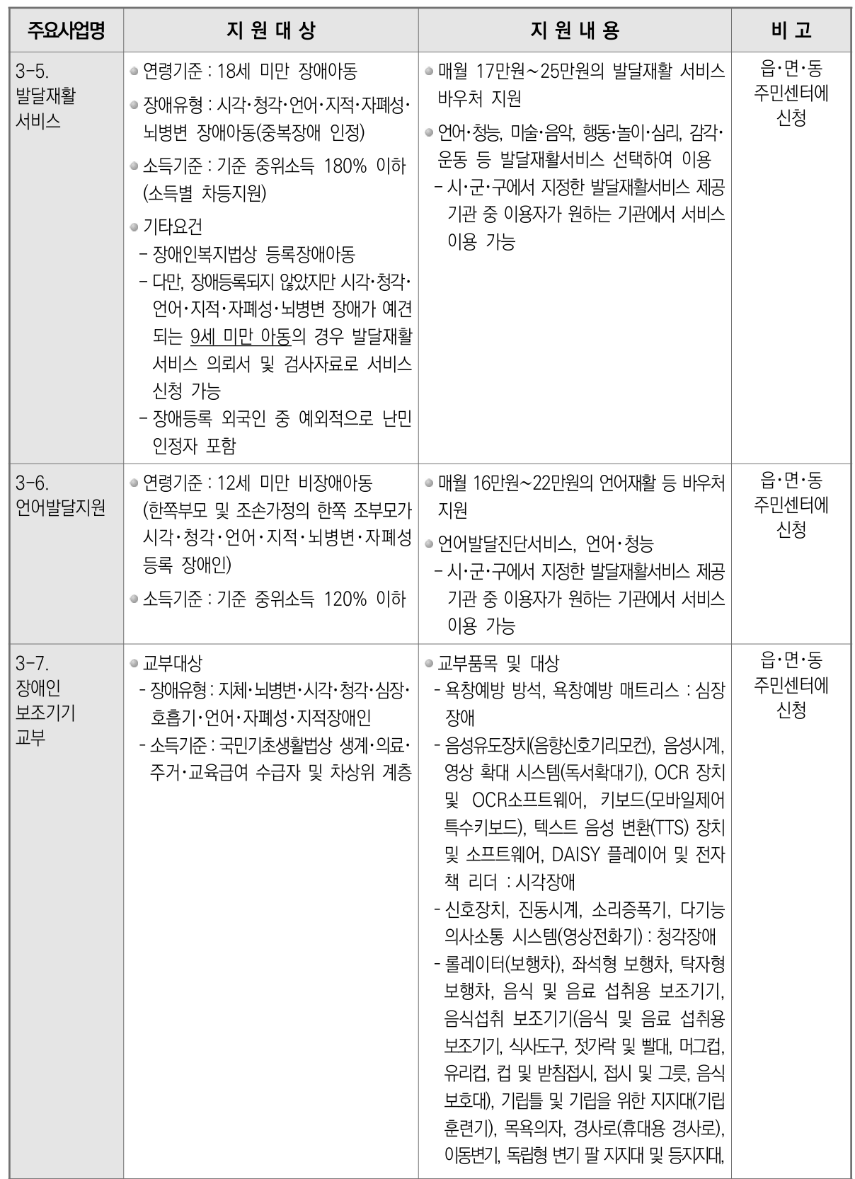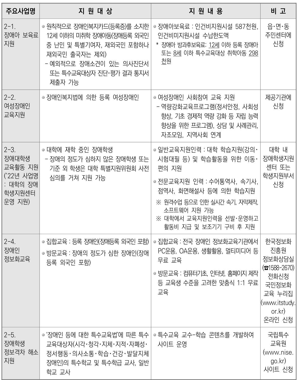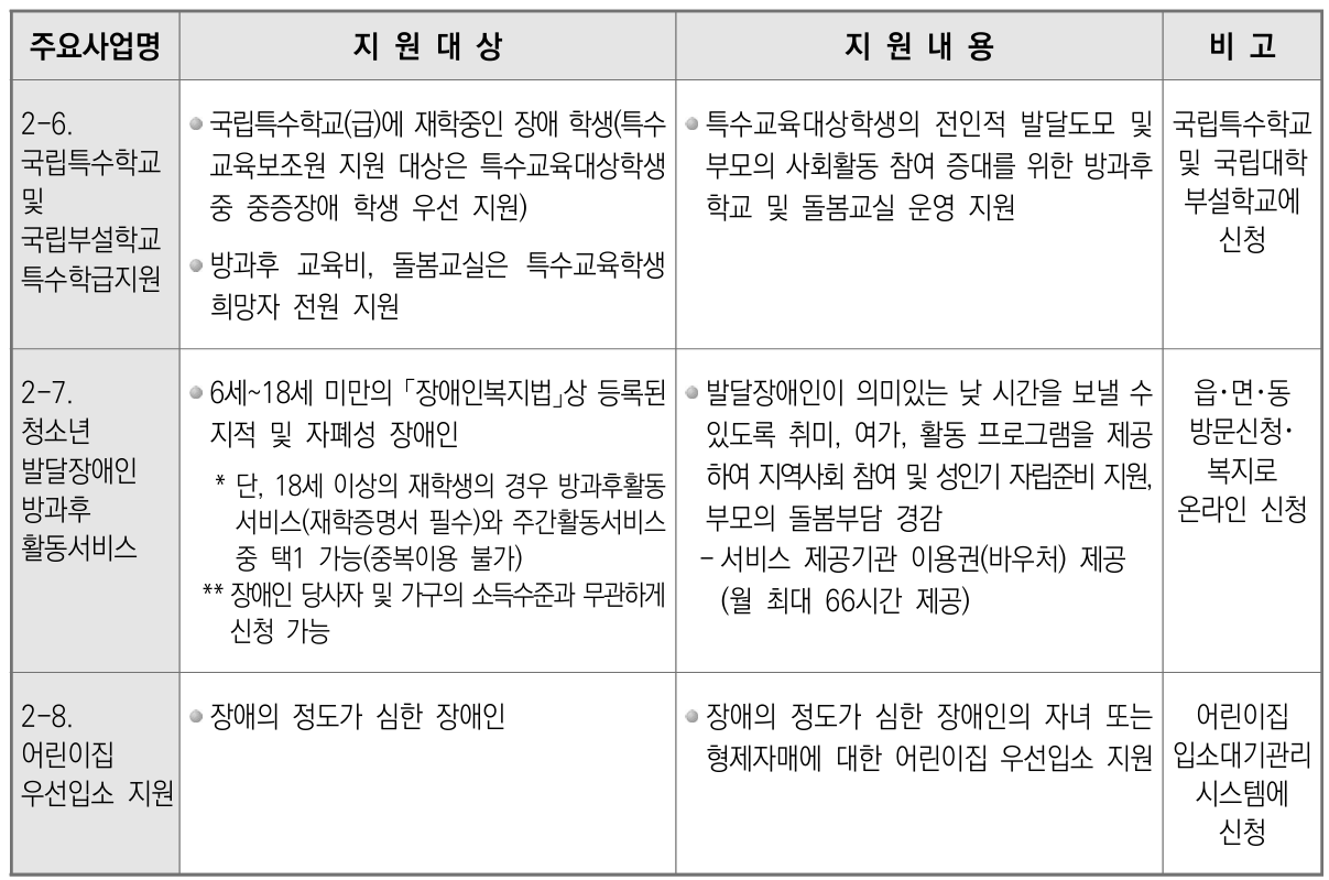장애아를 장애아보육료를 지원하고, 여성장애인, 장애대학생 등에서 세분화된 지원 서비스를 제공한다.