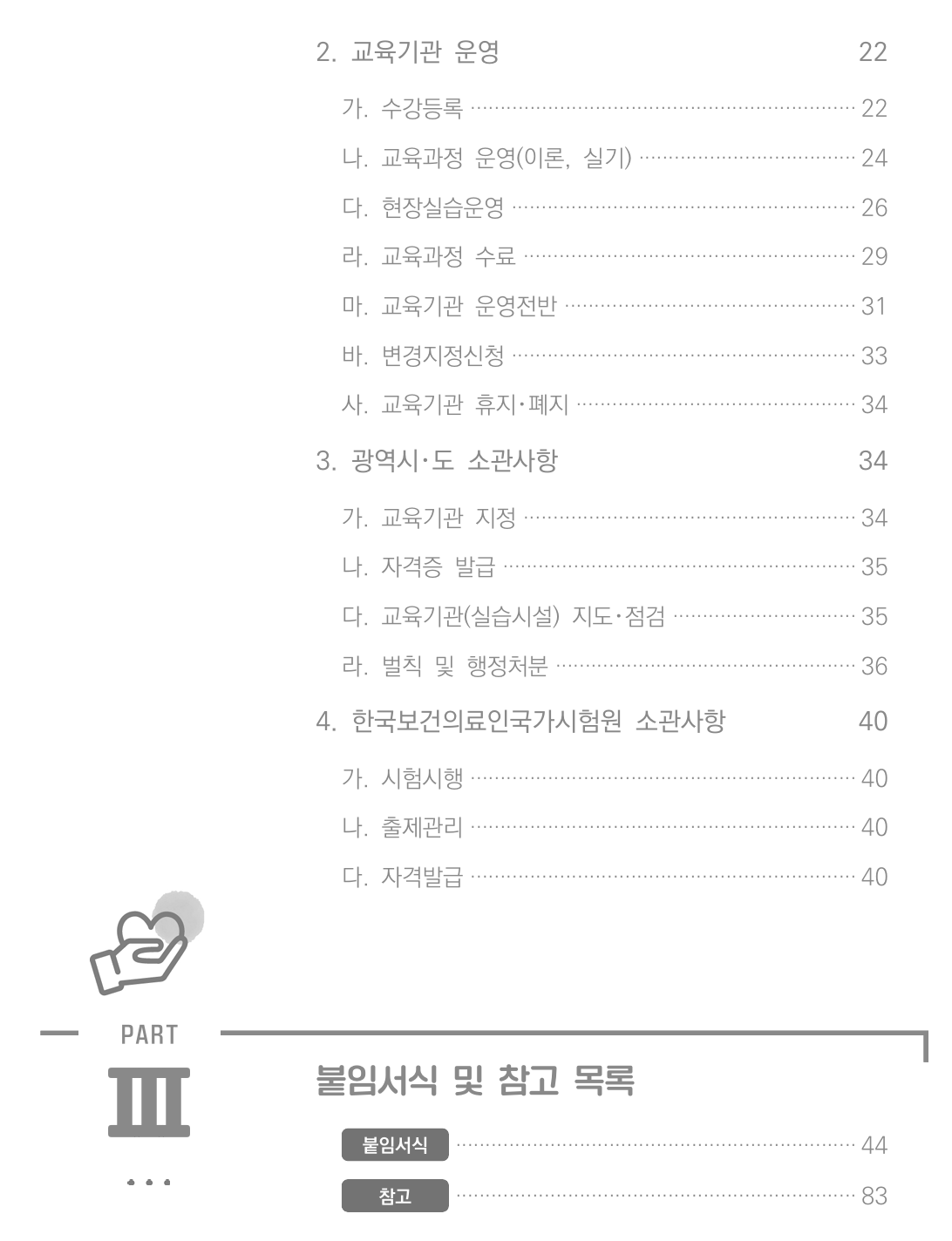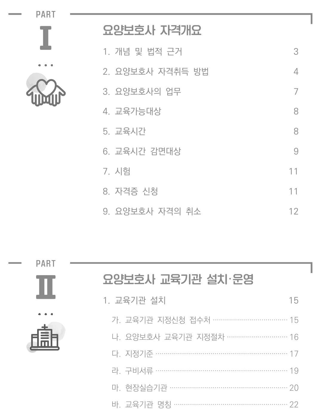 이 지침은 요양보호사 자격의 개념, 취득 방법, 요양보호사의 업무, 교육가능 대상, 교육시간, 교육과정, 시험, 자격관리 등을 포함한 자격 개요와 교육기관의 설치 및 운영 기준, 폐업 등을 체계적으로 설명한다. 또한 지자체와 국가시험원의 역할, 붙임 서식과 참고자료도 수록되어 실무에 유용하게 활용될 수 있다.