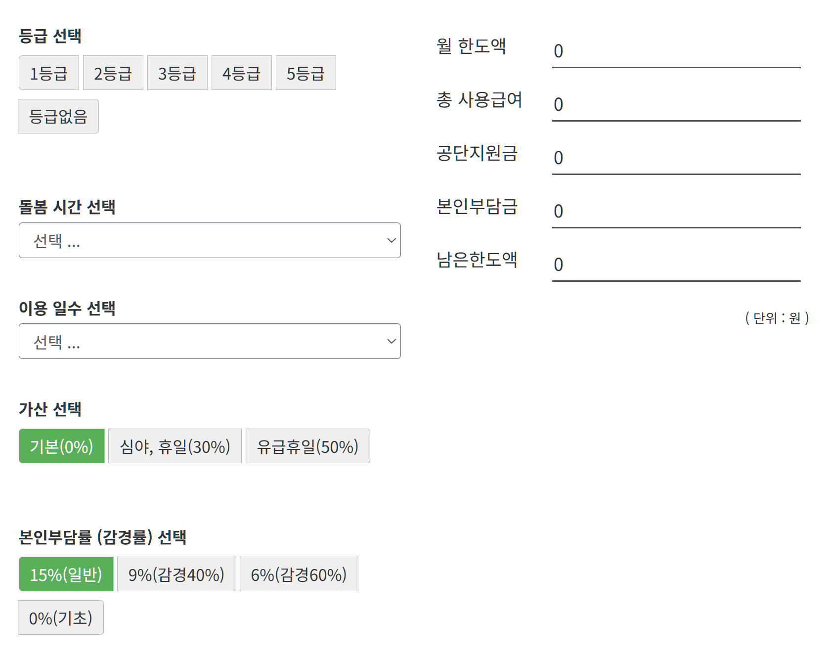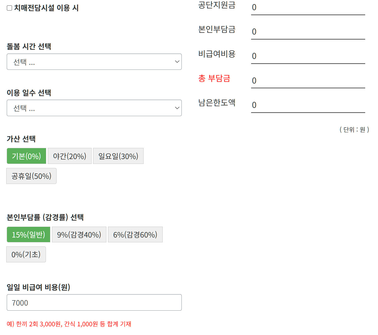 등급과 돌봄 시간, 이용 일수를 선택하면 본인부담금과 남은 월 한도액을 확인해 볼 수 있다.