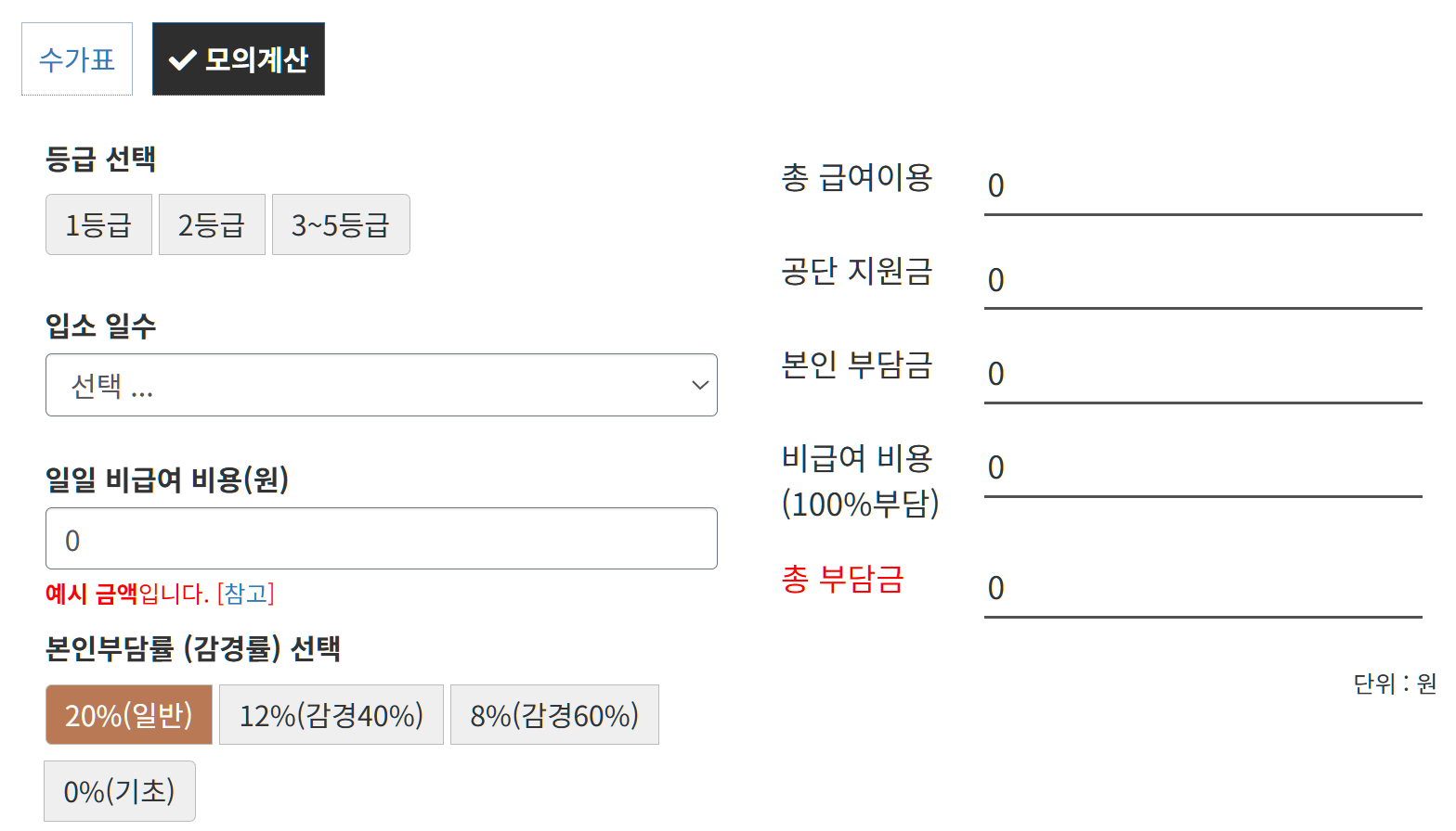 주야간보호 모의계산기는 돌봄 시간, 이용 일수 외에 추가적으로 일일 비급여 비용 입력 항목이 있다. 예시 금액이 입력되어 있으나 이는 기관마다 다르다.