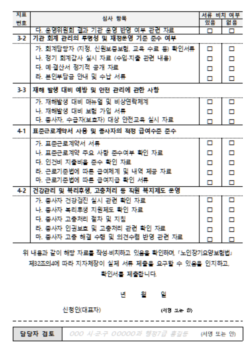6년 이상된 장기요양기관은 갱신대상에 포함되는 기관은 지정을 계속 유지하게 위해 갱신 신청을 해야 한다. 올해 말 유효기간이 끝나기 180일 전부터 심사를 진행해 90일 이전에 심사를 신청해야 하므로, 갱신 기관은 서류를 준비해 제출해야 한다.