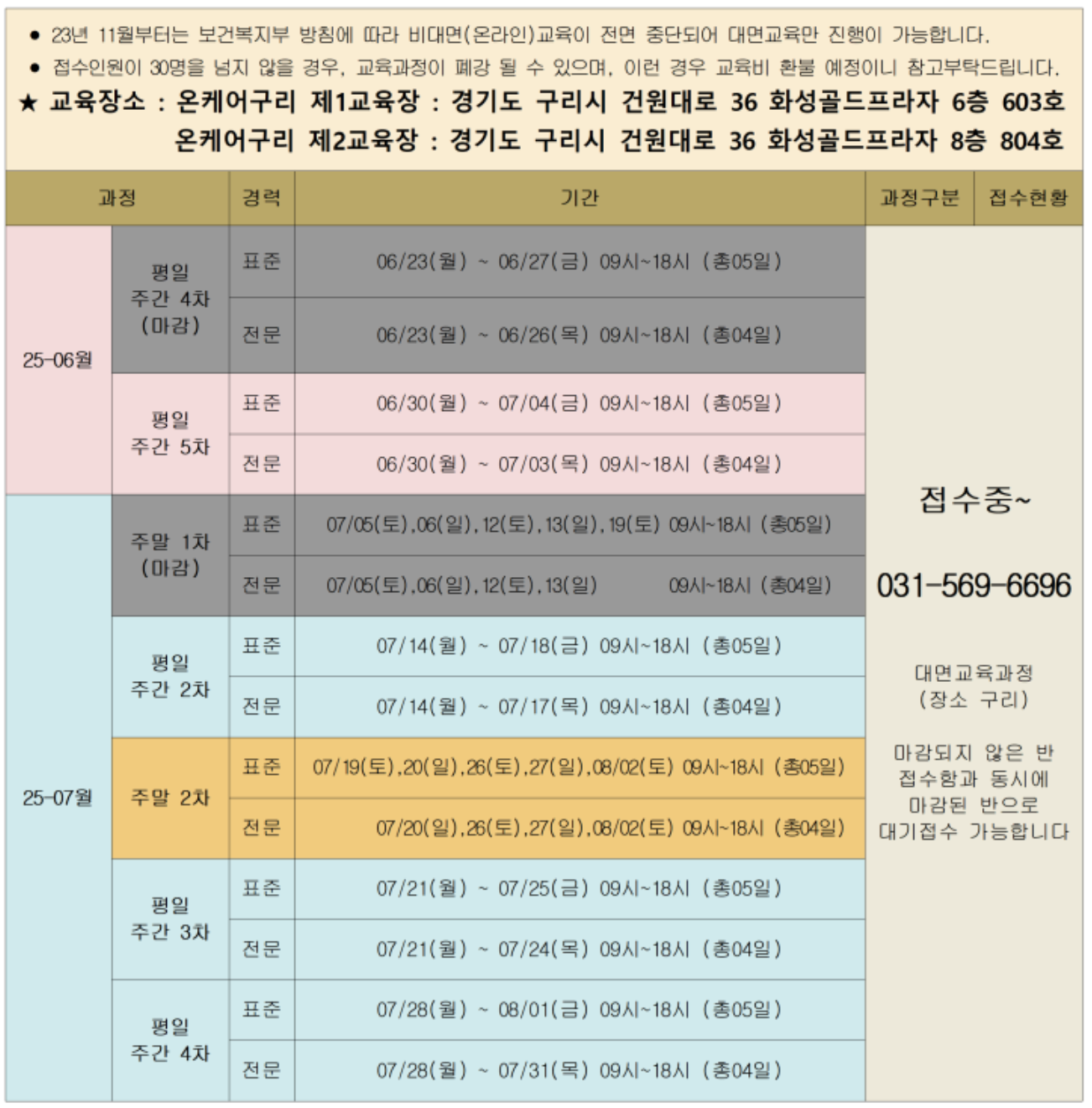 | 19회 | 토요반 7/26 8/2 8/9 8/16 8/23 일반교육 총 5일간 | 토요반 7/26 8/2 8/9 8/16 유사교육 총 4일간 |