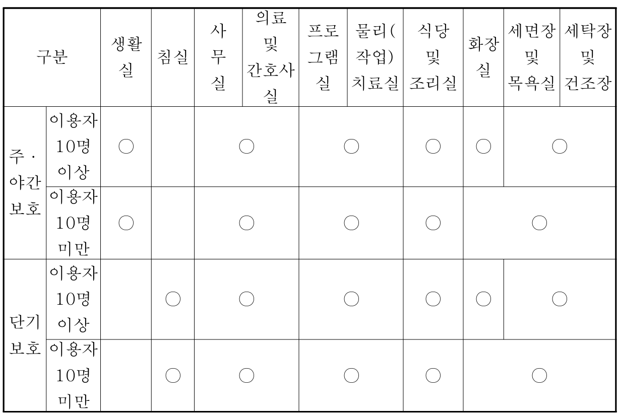 생활실, 침실, 사무실, 의료 및 간호사실, 프로그램실, 물리(작업)치료실, 식당 및 조리실, 화장실, 세면장 및 목욕실, 세탁장 및 건조장 등을 포함해야 하며, 이는 이용자 10명 이상일 경우 모두 갖추어야 한다. 10명 미만일 경우에는 일부 공간이 생략되거나 병용된다.