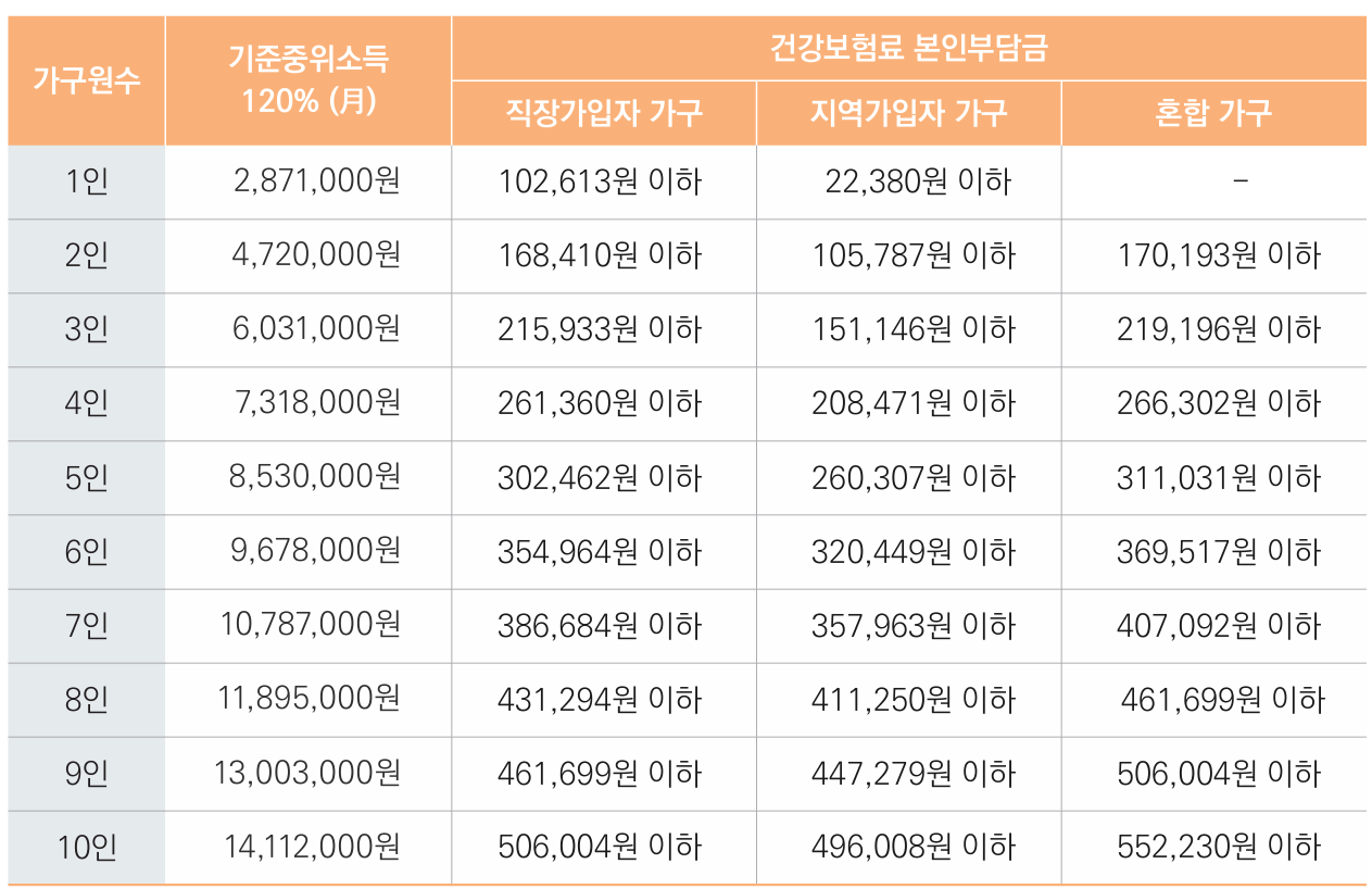 2단계는 기준중위소득 120% 이하인 경우이며, 월 건강보험료로 판정한다. 3단계는 소득 기준을 적용받지 않는다.