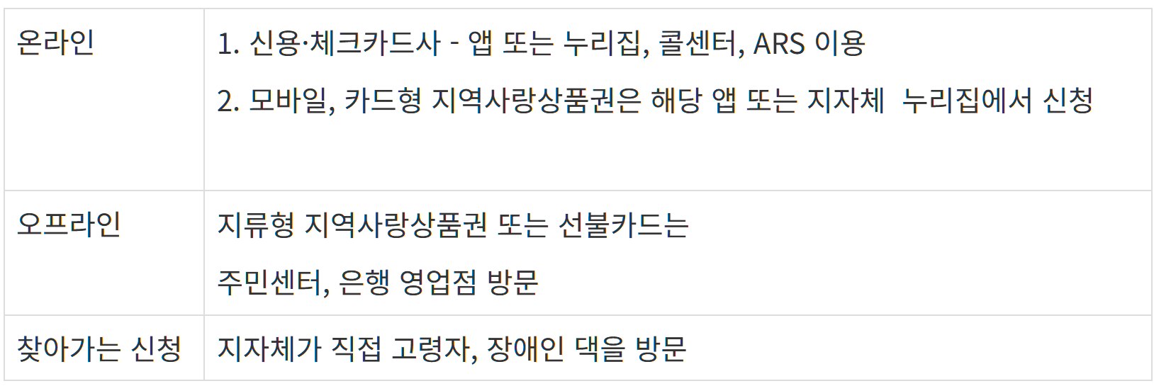 신청은 온라인, 오프라인, 찾아가는 신청 방식으로 진행합니다. 신용카드 또는 체크카드사의 앱, 누리집, 콜센터 등 온라인으로 신청할 수 있다. 오프라인은 주민센터 또는 은행 영업점을 방문해서 신청할 있습니다.
