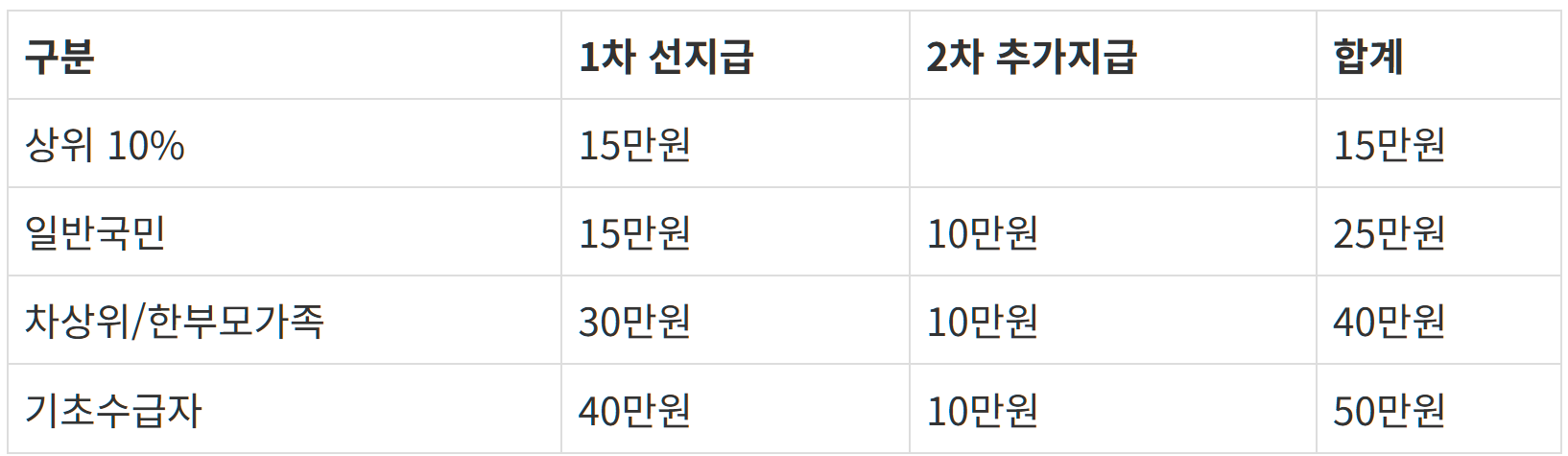 기본적으로 1차에서는 모든 국민에서 15만월 지급하고, 차상위계층, 기초생활 수급자는 차등 지급한다.