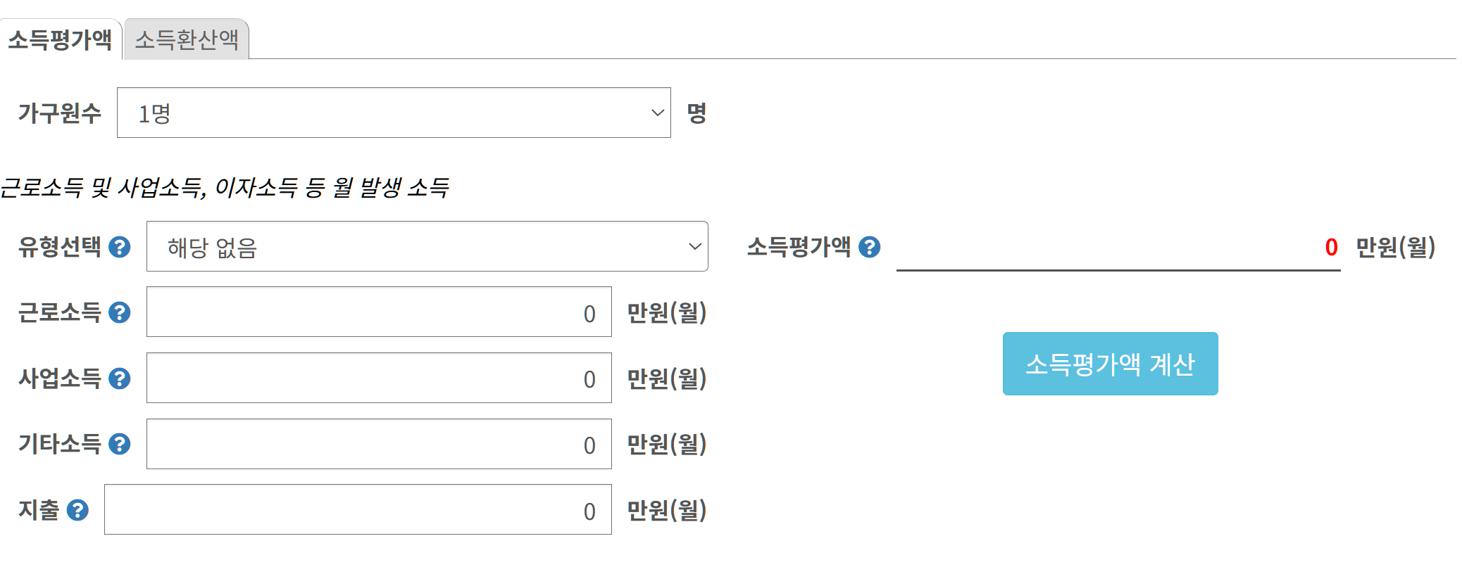 엔젤시터 차상위계층 소득인정액 모의계산기는 월 근로 및 사업에 대한 소득을 계산하는 소득평가액과 주거용재산, 금융재산, 차량 등 각종 재산을 월단위로 환산하는 소득환산액으로 각각 나눠 입력하고 얻어진 값을 합산한다.