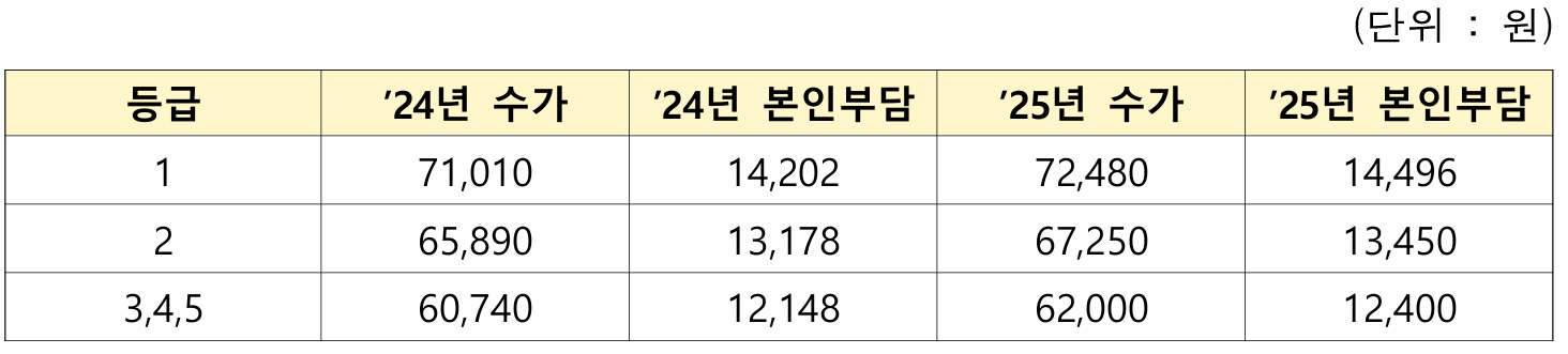 아래는 1일 단위의 요양원 입소 단가이다. 이를 한달 단위로 계산해 본다면 월 본인부담금을 확인해 볼 수 있다.