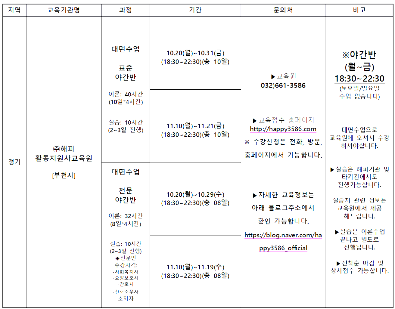 경기도에 위치한 활동지원사 교육기관의 10월 교육 일정 모음이다. 일정들은 기관 홈페이지에서 발취했다.