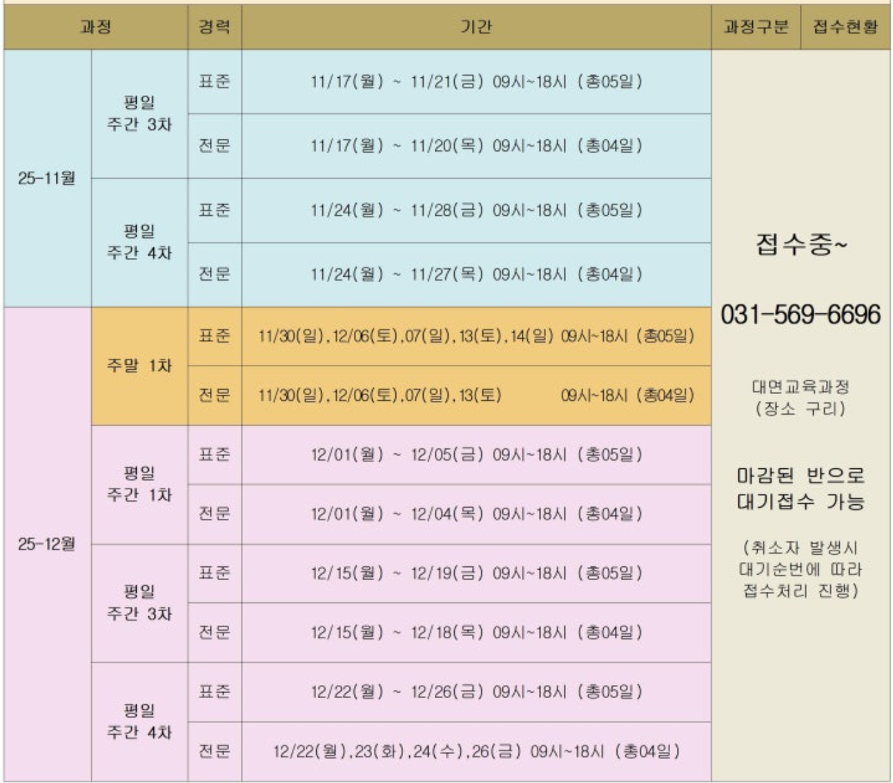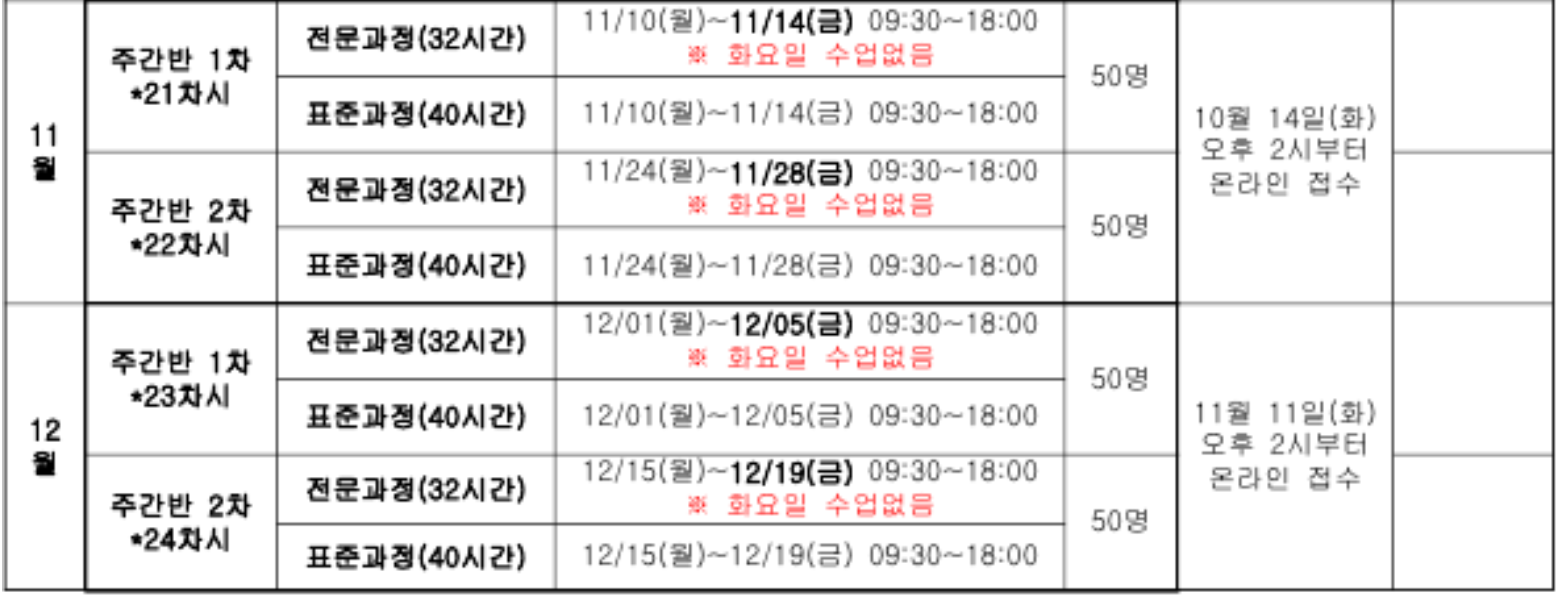 표준과정: 11월24일(월)~28일(금) / 전문과정:11월24일(월)~27일(목) / *실습 : 이론 교육 종료 후 10시간 진행(기간제한 없음) 접수 : 10.21.(화)09:00~ 선착순으로 마감함 |